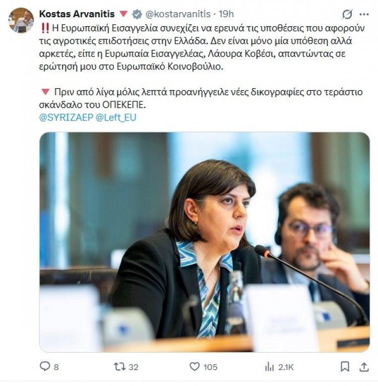 Η Eυρωπαία εισαγγελέας Λάουρα Κοβέσι αποκάλυψε σε νέες δηλώσεις της πως θα έρθουν κι άλλες δικογραφίες για το σκάνδαλο του ΟΠΕΚΕΠΕ. Συγκεκριμένα απαντώντας σε ερώτηση του ευρωβουλευτή του ΣΥΡΙΖΑ και αντιπροέδρου της Ευρωπαϊκής Αριστεράς, Κώστα Αρβανίτη, στο Ευρωπαϊκό Κοινοβούλιο, η εισαγγελέας επισήμανε πως: