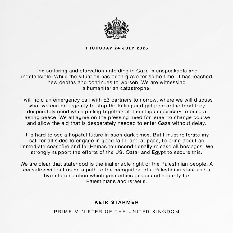 Το Παρίσι, το Λονδίνο και το Βερολίνο συμφωνούν «για μια επείγουσα ανάγκη το Ισραήλ να αλλάξει πορεία και να επιτρέψει την άμεση είσοδο στη Γάζα της απεγνωσμένα απαραίτητης βοήθειας», πρόσθεσε ο Κιρ Στάρμερ. Επέμεινε επίσης ότι η ύπαρξη ενός Κράτους της Παλαιστίνης είναι «αναφαίρετο δικαίωμα του παλαιστινιακού λαού» .
