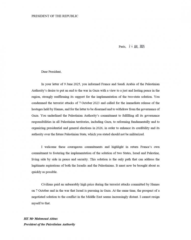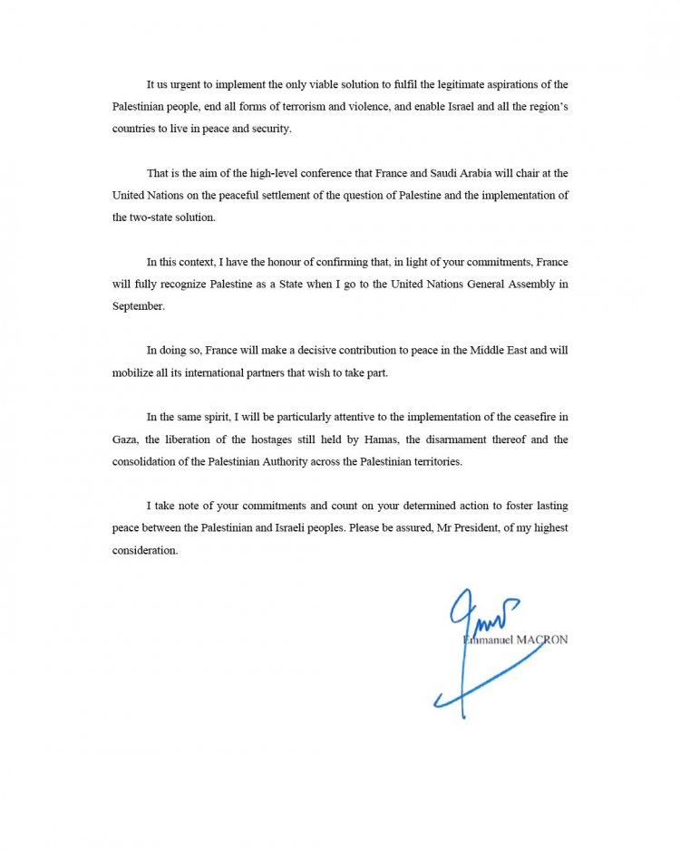«Πιστός στην ιστορική του δέσμευση για μια δίκαιη και διαρκή ειρήνη στη Μέση Ανατολή, αποφάσισα ότι η Γαλλία θα αναγνωρίσει το Κράτος της Παλαιστίνης.