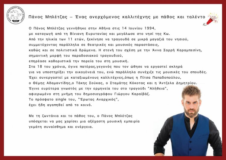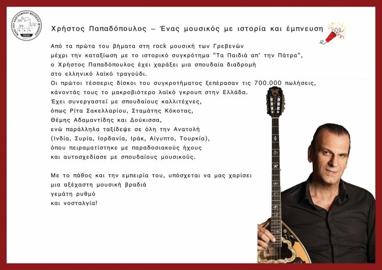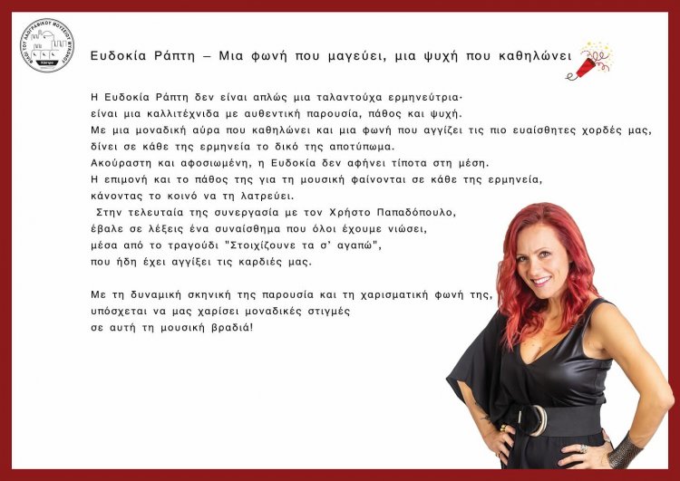 Μαζί μας, ο καταξιωμένος μουσικοσυνθέτης Χρήστος Παπαδόπουλος, η Ευδοκία Ράπτη και ο Πάνος Μπλέτζας με την ορχήστρα τους, που θα μας χαρίσουν μοναδικές στιγμές διασκέδασης.