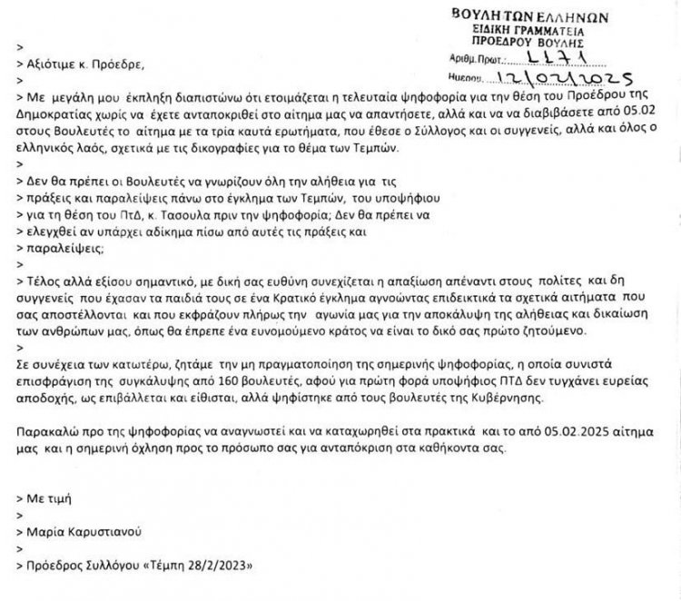 Λίγο πριν εκκινήσει η σημερινή διαδικασία στη Βουλή, η Μαρία Καρυστιανού έστειλε επιστολή στον Πρόεδρο της Βουλής, Νικήτα Κακλαμάνη, με την οποία ζητούσε να μην διεξαχθεί η σημερινή ψηφοφορία.