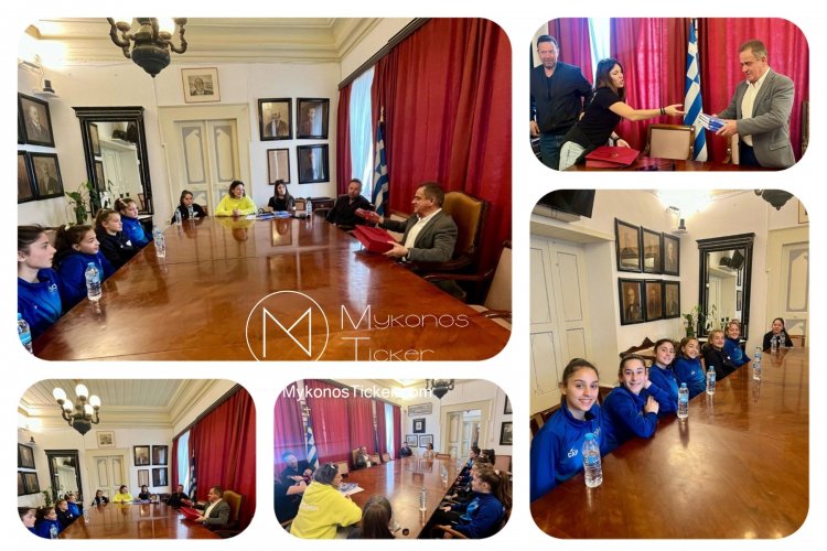 O Xpήστos Bεpώvηs υποδέχθηκε και συνεχάρη τις διακριθείσες αθλήτριες του Mykonos Junior της Α.Ε Μυκόνου