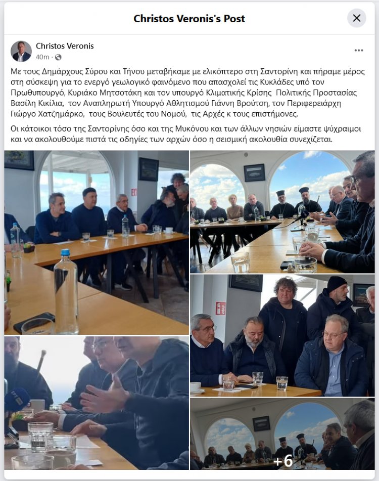 Santorini earthquakes / Στη Σαντορίνη μετέβησαν το πρωί της Παρασκευής οι Δήμαρχοι Μυκόνου, Σύρου και Τήνου, κ.κ. Χρήστος Βερώνης, Αλέξης Αθανασίου και Παναγιώτης Κροντηράς αντίστοιχα, ενώ βρίσκεται σε εξέλιξη για ακόμη μία ημέρα η έντονη σεισμική δραστηριότητα στις Κυκλάδες, προκειμένου να συμμετάσχουν στις συναντήσεις του πρωθυπουργού και των υπουργών που τον συνοδεύουν με τους αρμόδιους με στόχο να ενημερωθούν για την κατάσταση στο νησί λόγω της έντονης σεισμικής δραστηριότητας των τελευταίων ημερών.