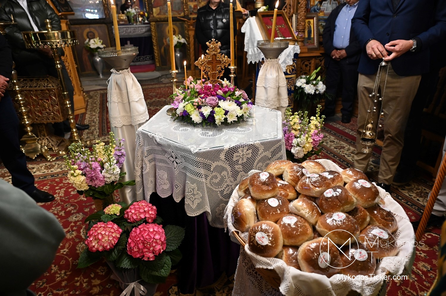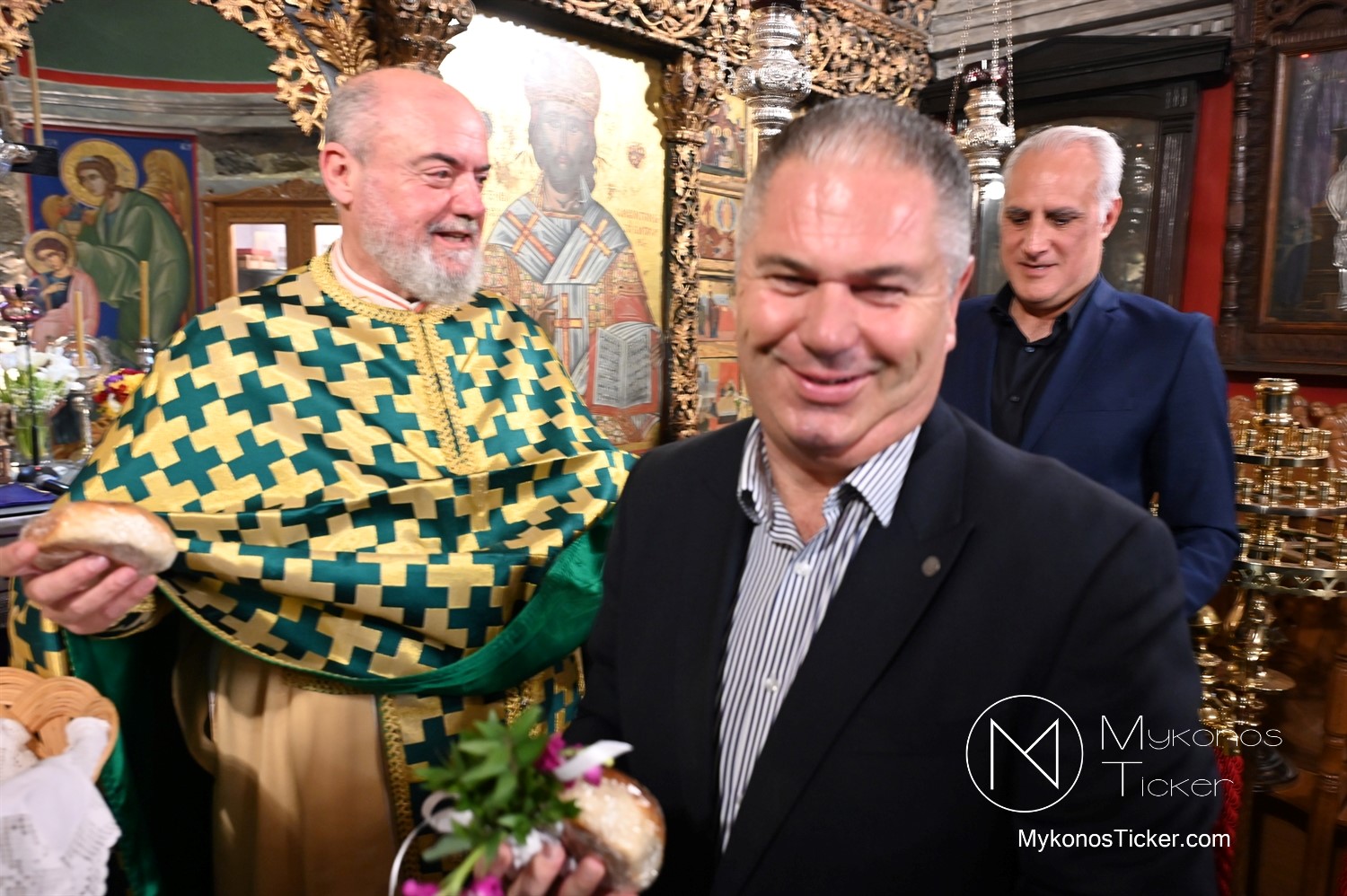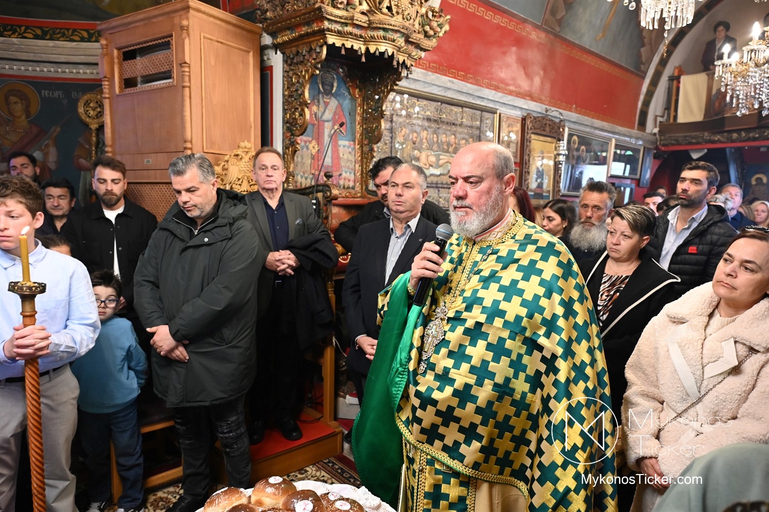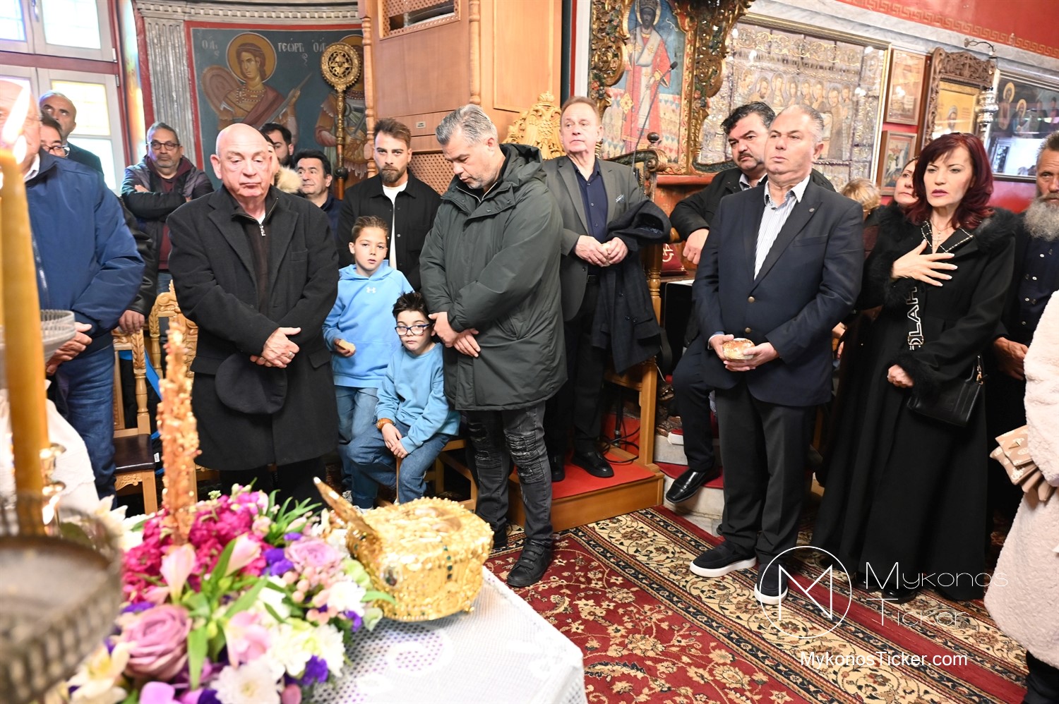 Η Θεία Λειτουργία κατεξοχήν σημαίνει «κοινό έργο» και πράξη κοινωνίας. Στο πλαίσιο αυτό, είναι ιδιαιτέρως βαρύνουσα και θεολογικά πλήρης η σύσσωμη παρουσία της τοπικής κοινότητας. Με αισθήματα βαθύτατης κατάνυξης και σεβασμού προς τα ιερά θέσμια, παρέστη συμπροσευχητικώς ο Δήμαρχος Μυκόνου Χρήστος Βερώνης. Η παρουσία του πρώτου πολίτη του νησιού, πλαισιωμένου από τον Περιφερειακό Σύμβουλο Στέλιο Μπρίγγο, καθώς και τους Δημοτικούς Συμβούλους . Βασίλη Θεοχάρη, Φραντζέσκο Βιγλιάρη, Νικόλαο Γκέλο και Αντώνη Κουσαθανά, αναδεικνύει την άρρηκτη ενότητα άρχουσας τάξης και λαού του Θεού. Όλοι ομού, συντεταγμένοι ως μία λειτουργική κοινότητα, έκλιναν τον αυχένα ενώπιον του κοινού Συμβόλου της Σωτηρίας.
