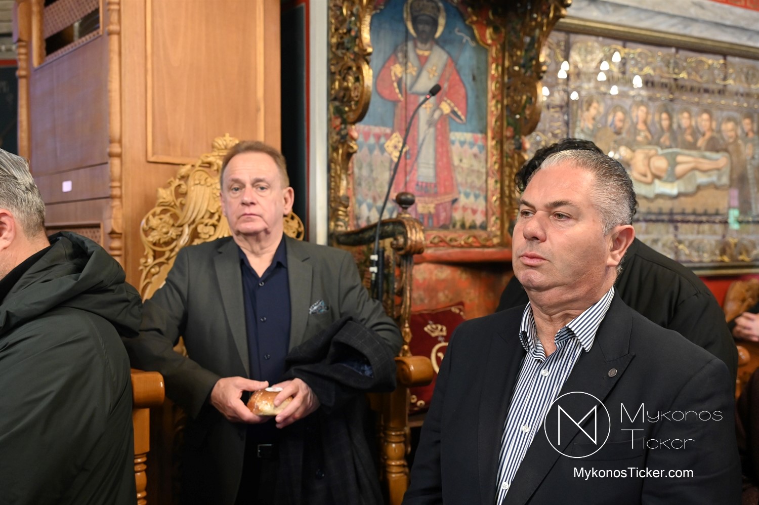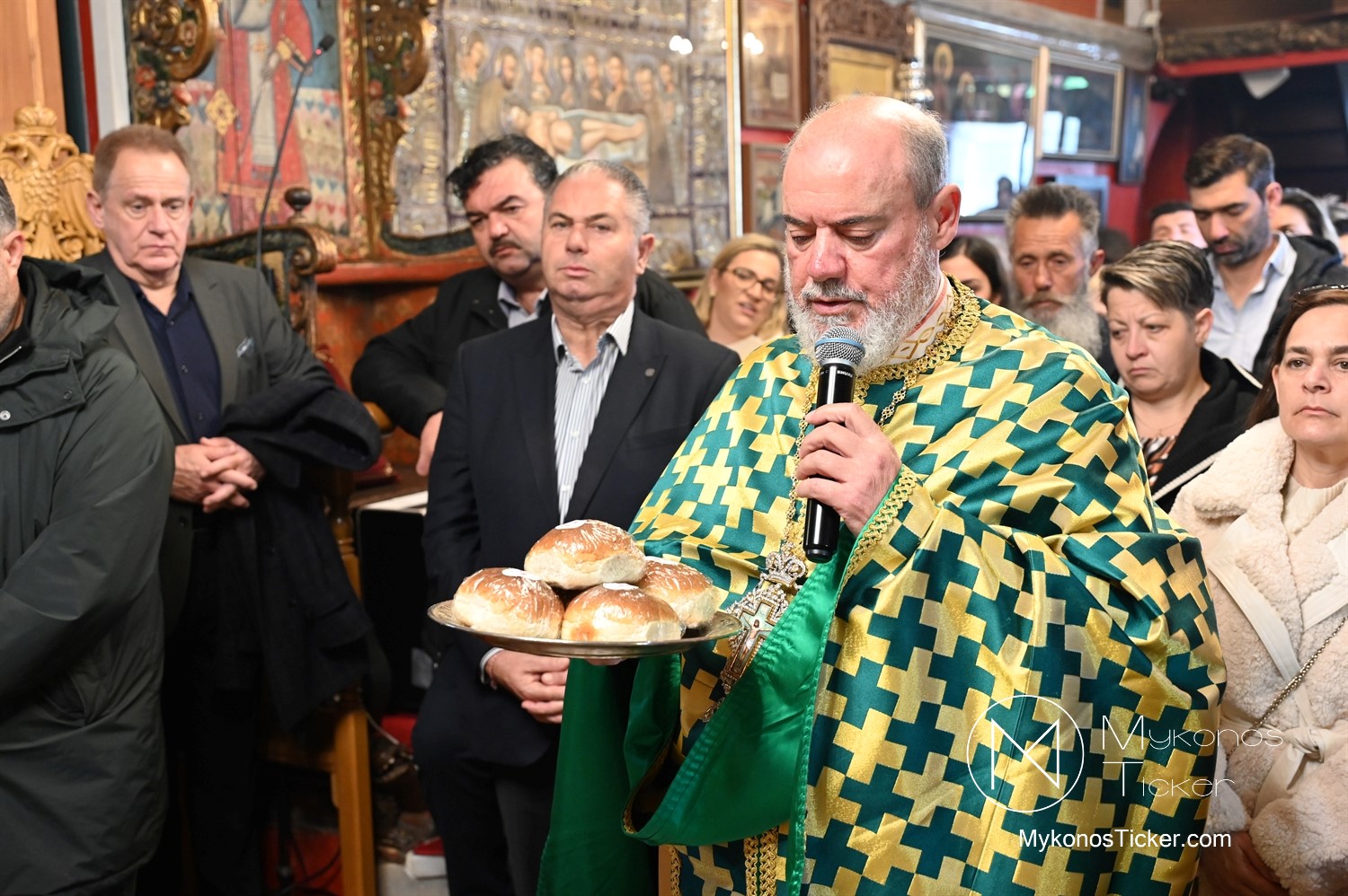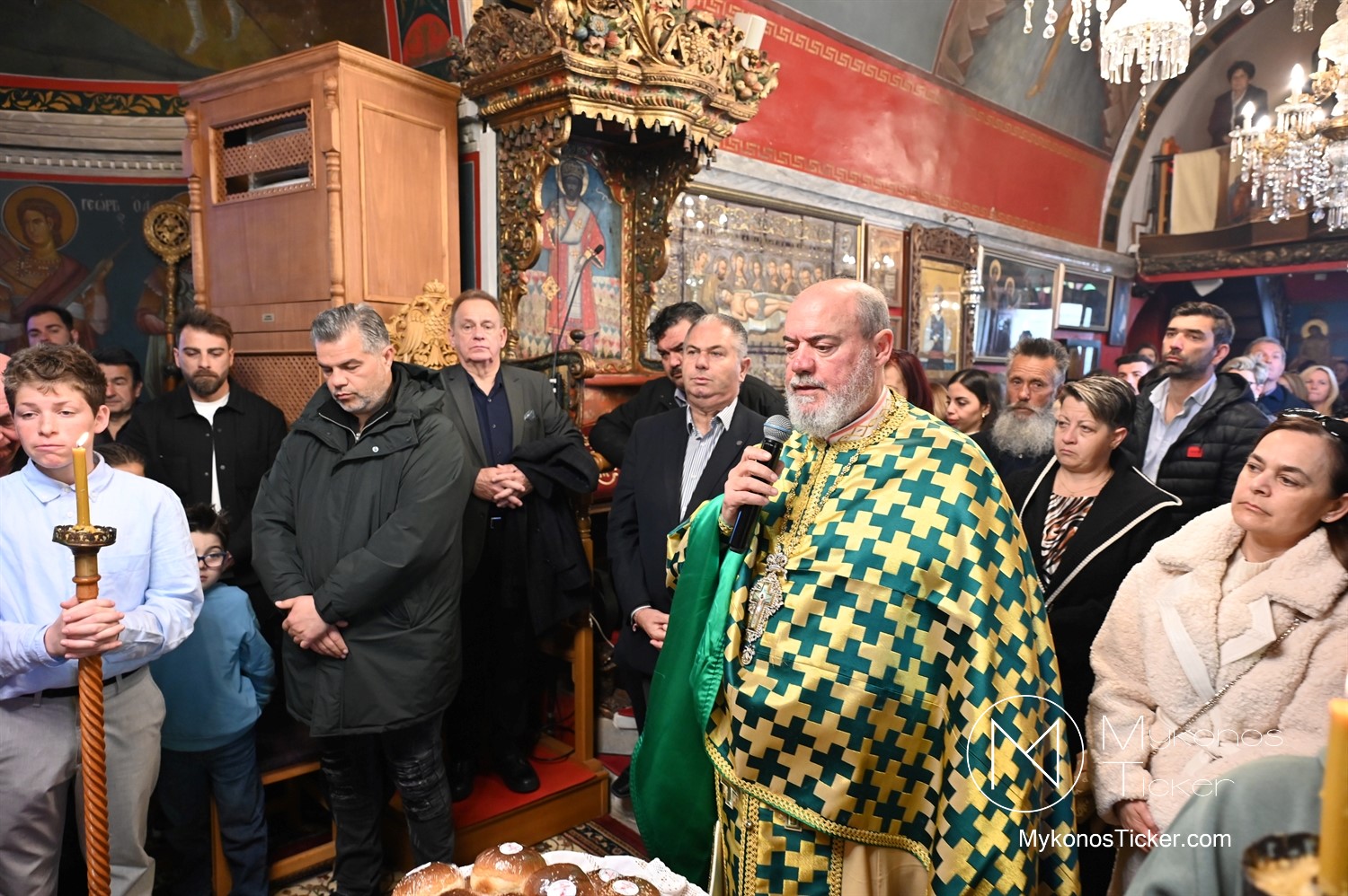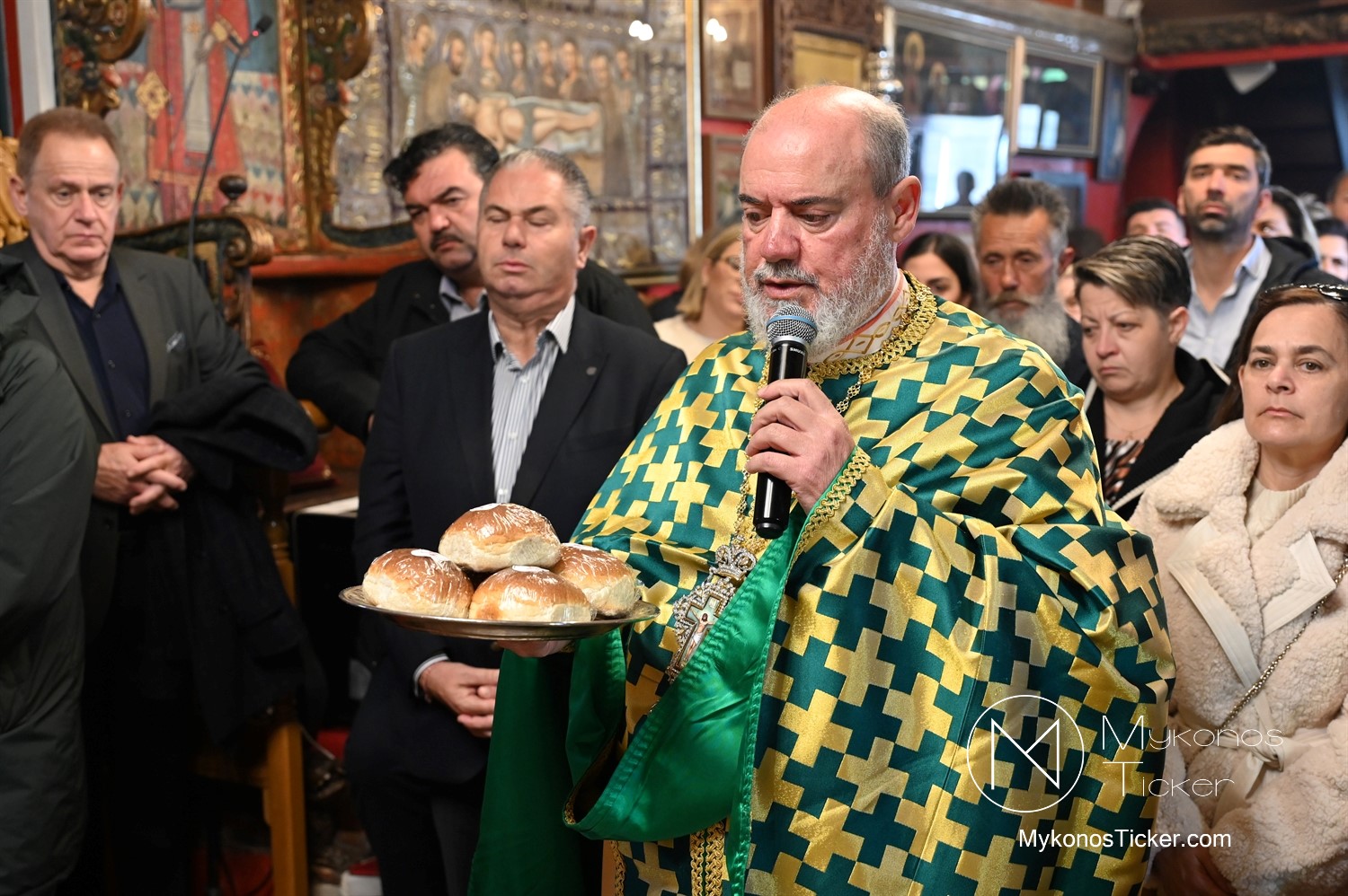Η Θεία Λειτουργία κατεξοχήν σημαίνει «κοινό έργο» και πράξη κοινωνίας. Στο πλαίσιο αυτό, είναι ιδιαιτέρως βαρύνουσα και θεολογικά πλήρης η σύσσωμη παρουσία της τοπικής κοινότητας. Με αισθήματα βαθύτατης κατάνυξης και σεβασμού προς τα ιερά θέσμια, παρέστη συμπροσευχητικώς ο Δήμαρχος Μυκόνου Χρήστος Βερώνης. Η παρουσία του πρώτου πολίτη του νησιού, πλαισιωμένου από τον Περιφερειακό Σύμβουλο Στέλιο Μπρίγγο, καθώς και τους Δημοτικούς Συμβούλους . Βασίλη Θεοχάρη, Φραντζέσκο Βιγλιάρη, Νικόλαο Γκέλο και Αντώνη Κουσαθανά, αναδεικνύει την άρρηκτη ενότητα άρχουσας τάξης και λαού του Θεού. Όλοι ομού, συντεταγμένοι ως μία λειτουργική κοινότητα, έκλιναν τον αυχένα ενώπιον του κοινού Συμβόλου της Σωτηρίας.