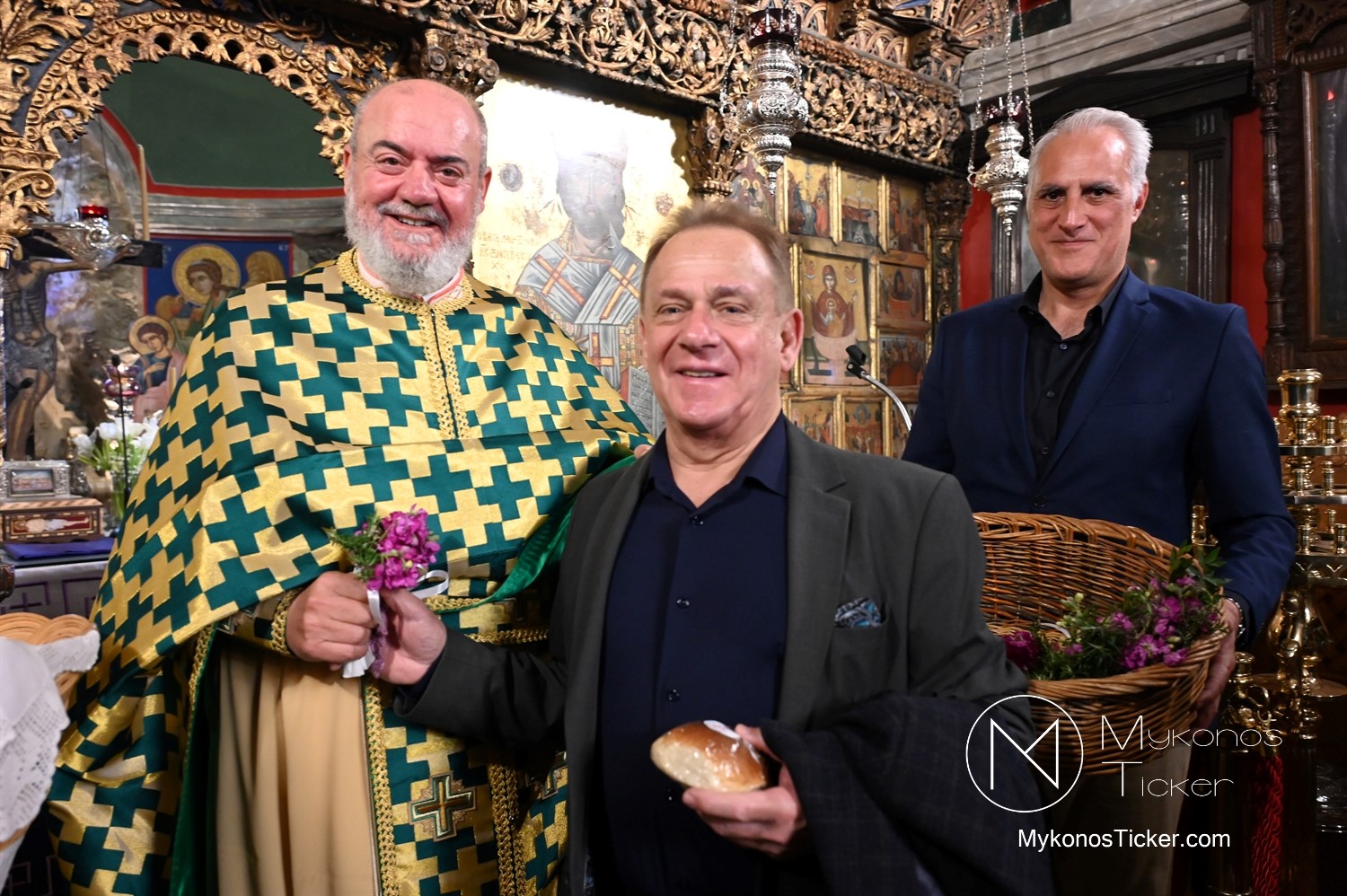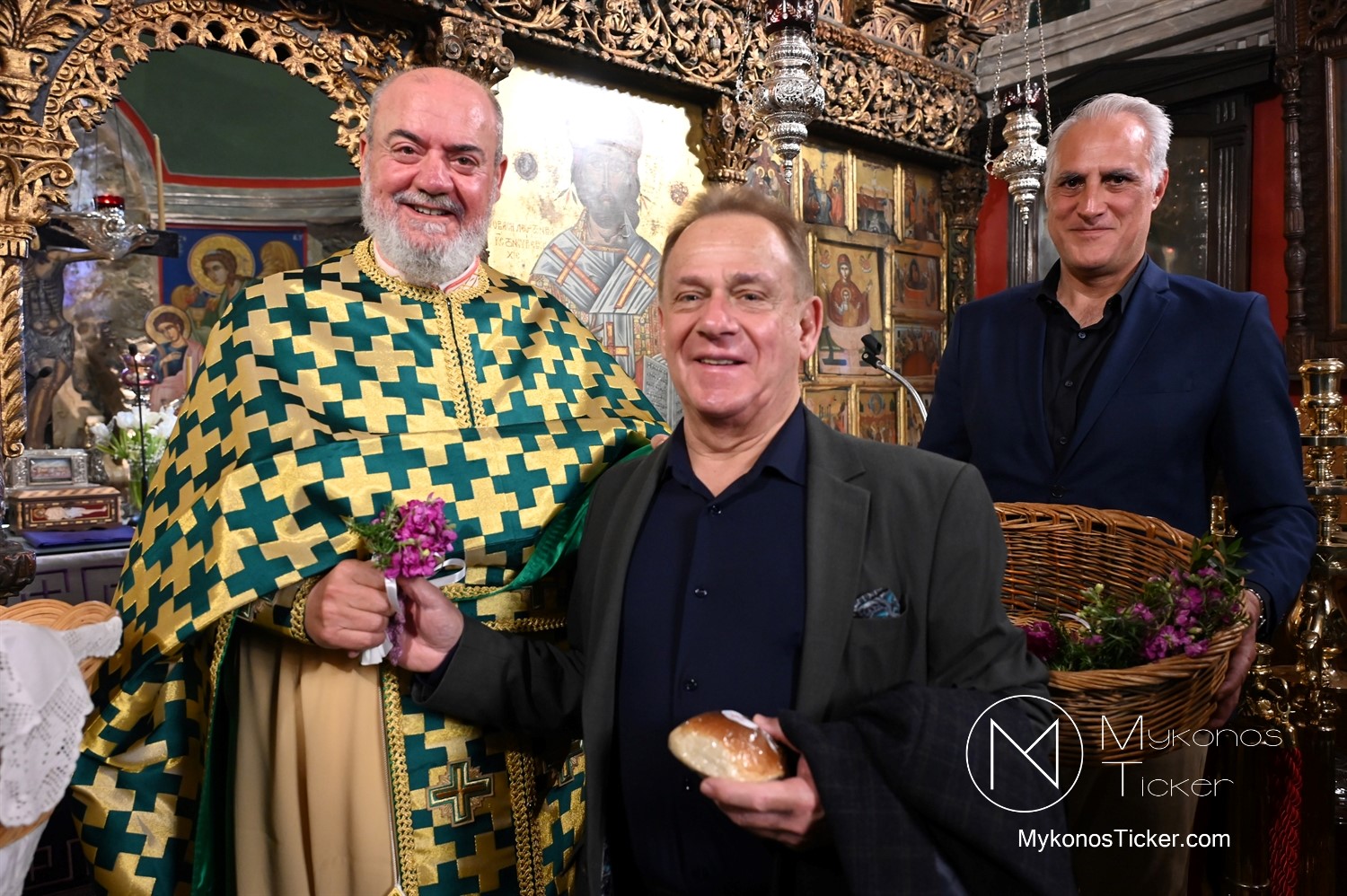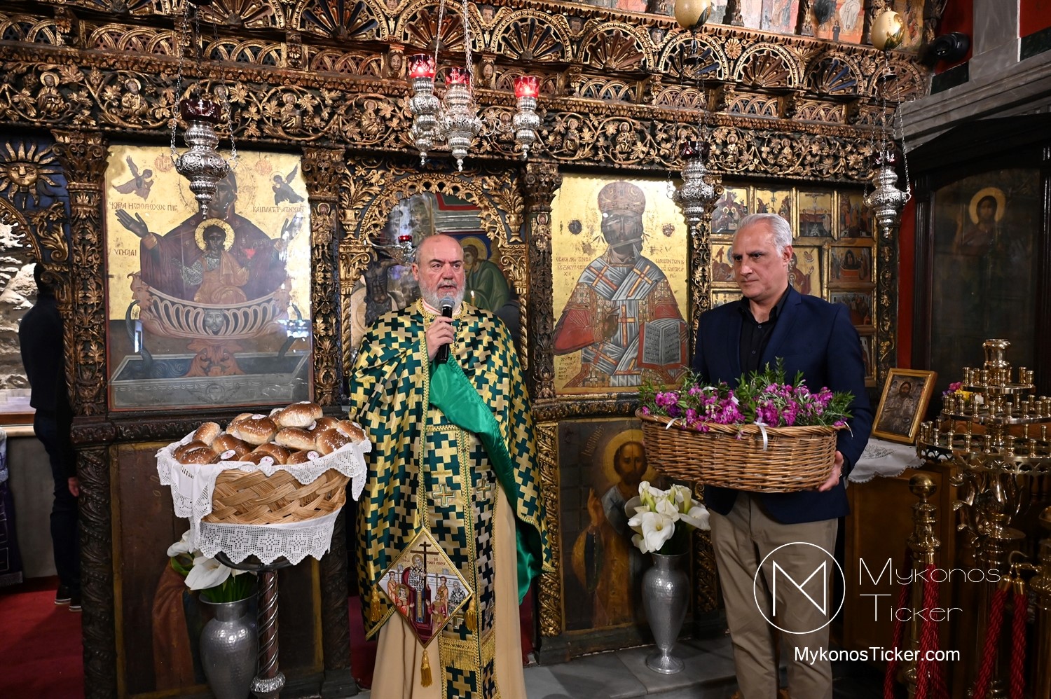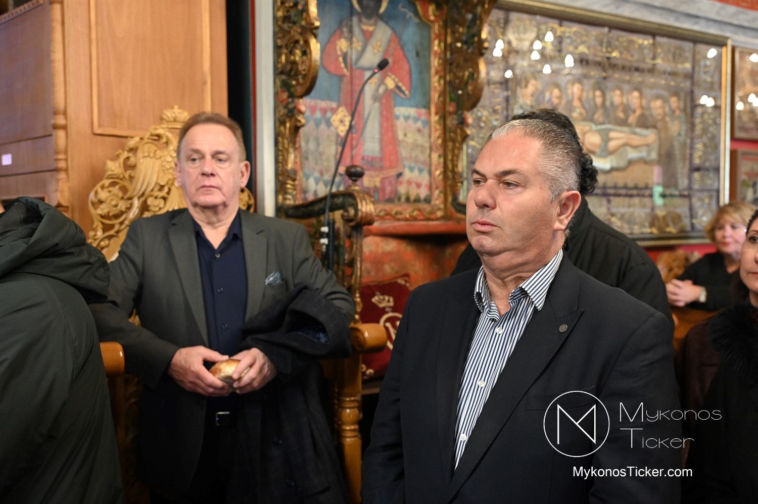 Η Θεία Λειτουργία κατεξοχήν σημαίνει «κοινό έργο» και πράξη κοινωνίας. Στο πλαίσιο αυτό, είναι ιδιαιτέρως βαρύνουσα και θεολογικά πλήρης η σύσσωμη παρουσία της τοπικής κοινότητας. Με αισθήματα βαθύτατης κατάνυξης και σεβασμού προς τα ιερά θέσμια, παρέστη συμπροσευχητικώς ο Δήμαρχος Μυκόνου Χρήστος Βερώνης. Η παρουσία του πρώτου πολίτη του νησιού, πλαισιωμένου από τον Περιφερειακό Σύμβουλο Στέλιο Μπρίγγο, καθώς και τους Δημοτικούς Συμβούλους . Βασίλη Θεοχάρη, Φραντζέσκο Βιγλιάρη, Νικόλαο Γκέλο και Αντώνη Κουσαθανά, αναδεικνύει την άρρηκτη ενότητα άρχουσας τάξης και λαού του Θεού. Όλοι ομού, συντεταγμένοι ως μία λειτουργική κοινότητα, έκλιναν τον αυχένα ενώπιον του κοινού Συμβόλου της Σωτηρίας.