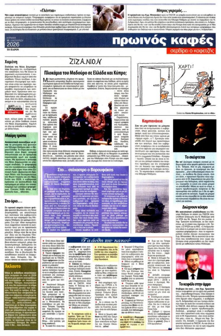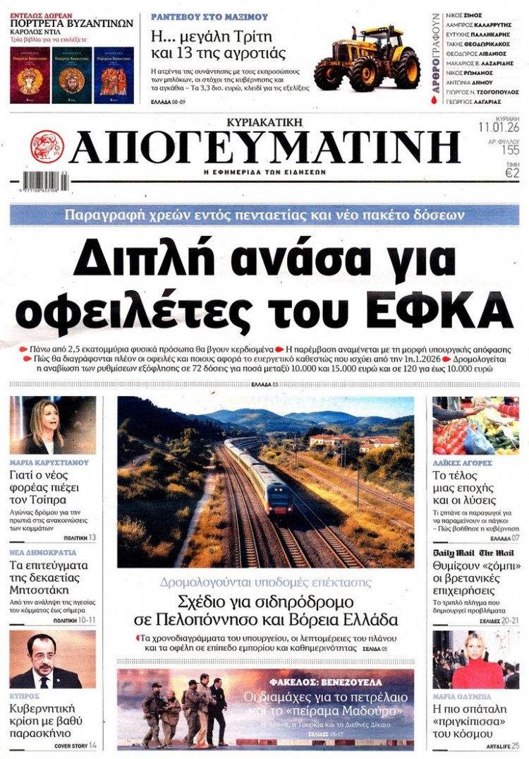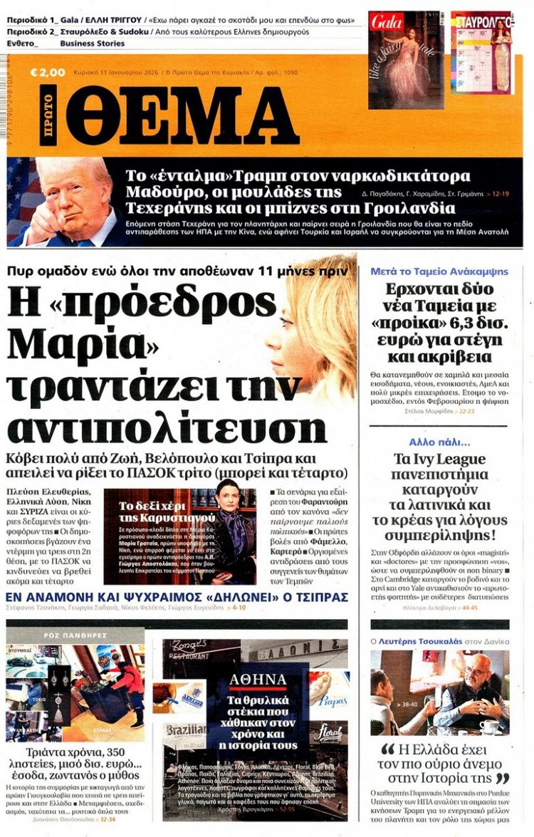 Sunday's Front pages: Global Shocks & Greek Political Realignment 2026 | The news cycle of Sunday, January 11, 2026, is defined by the aggressive "Trump Doctrine" in Venezuela and Greenland and a major realignment in Greek politics. While domestic reforms target property taxes and debt relief, the emergence of Maria Karystianou's party challenges the traditional political establishment.
