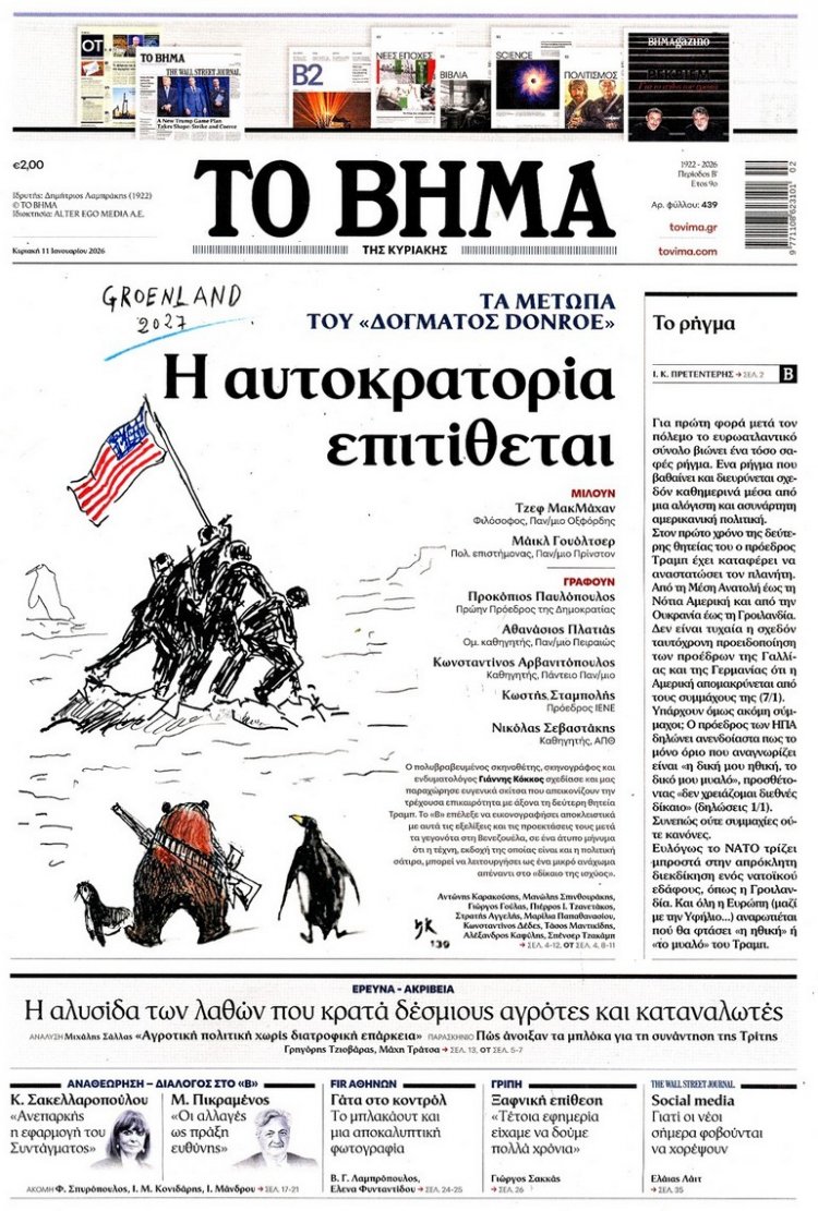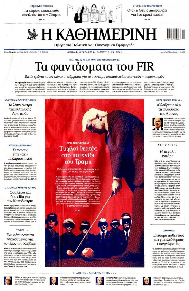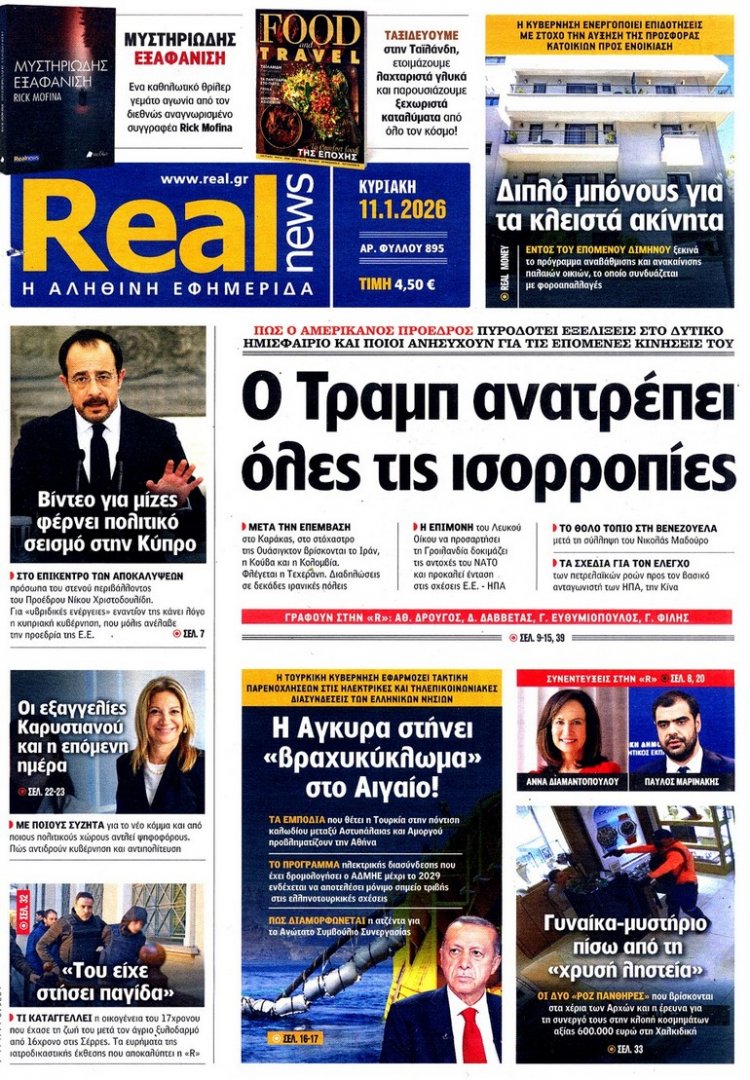 Ανάλυση των Κυριακάτικων πρωτοσέλιδων της 11ης Ιανουαρίου 2026. Το επιθετικό «Δόγμα Τραμπ», η άνοδος της Καρυστιανού και οι 8 σαρωτικές αλλαγές στα ακίνητα.