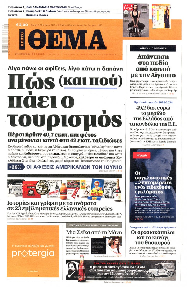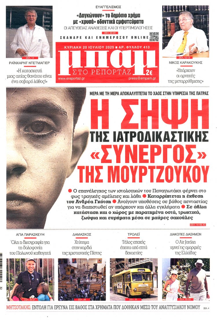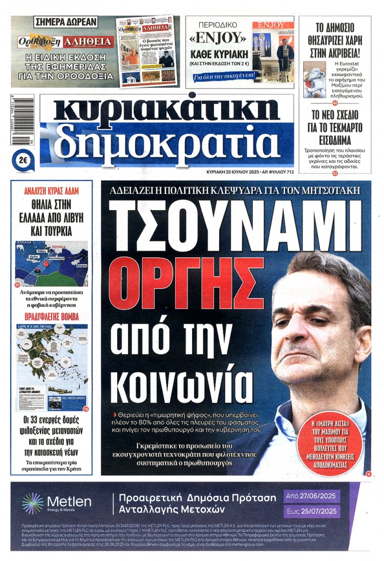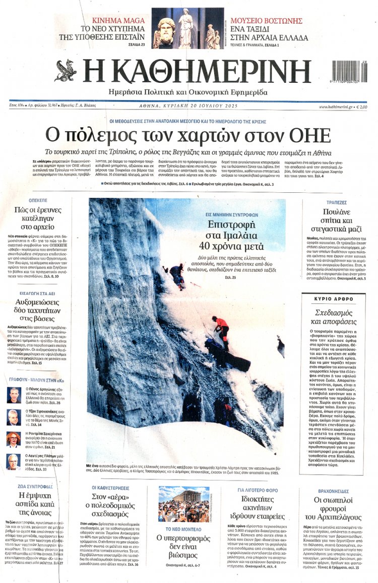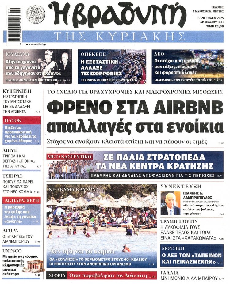 Sunday's front pages: Τα Πρωτοσέλιδα και τα Οπισθόφυλλα των εφημερίδων της Κυριακής 20 Ιουλίου 2025