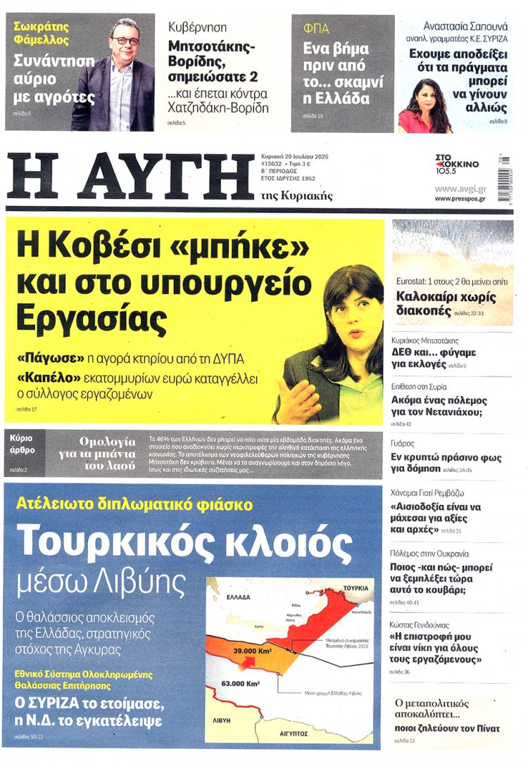 Διαβάστε τα 15 πρώτα Πρωτοσέλιδα και τα Οπισθόφυλλα των Κυριακάτικων Εφημερίδων της Κυριακής 20 Ιουλίου 2025