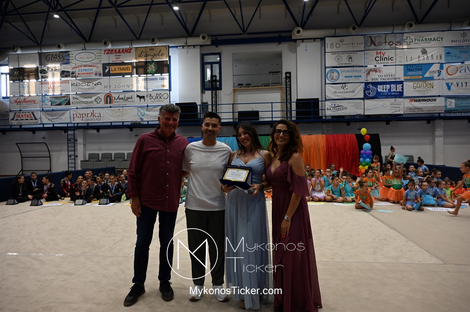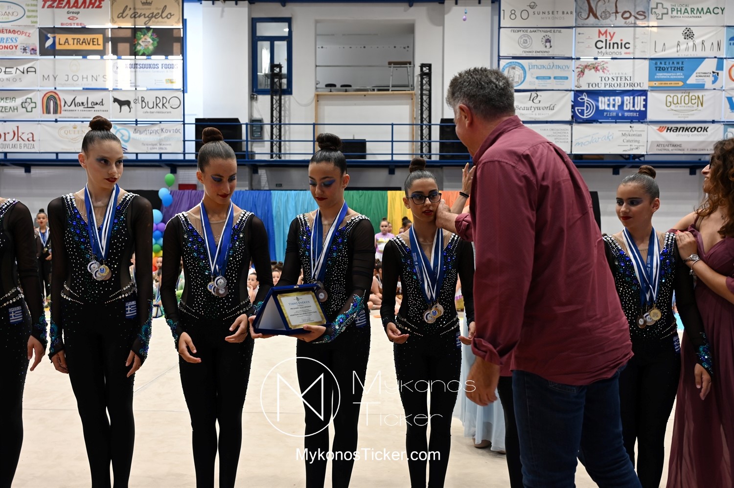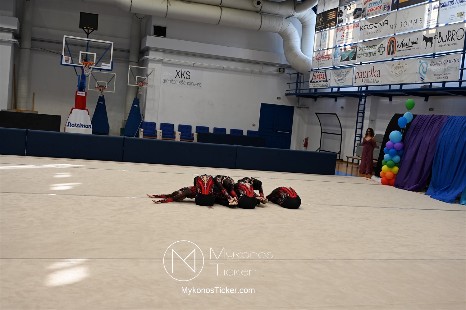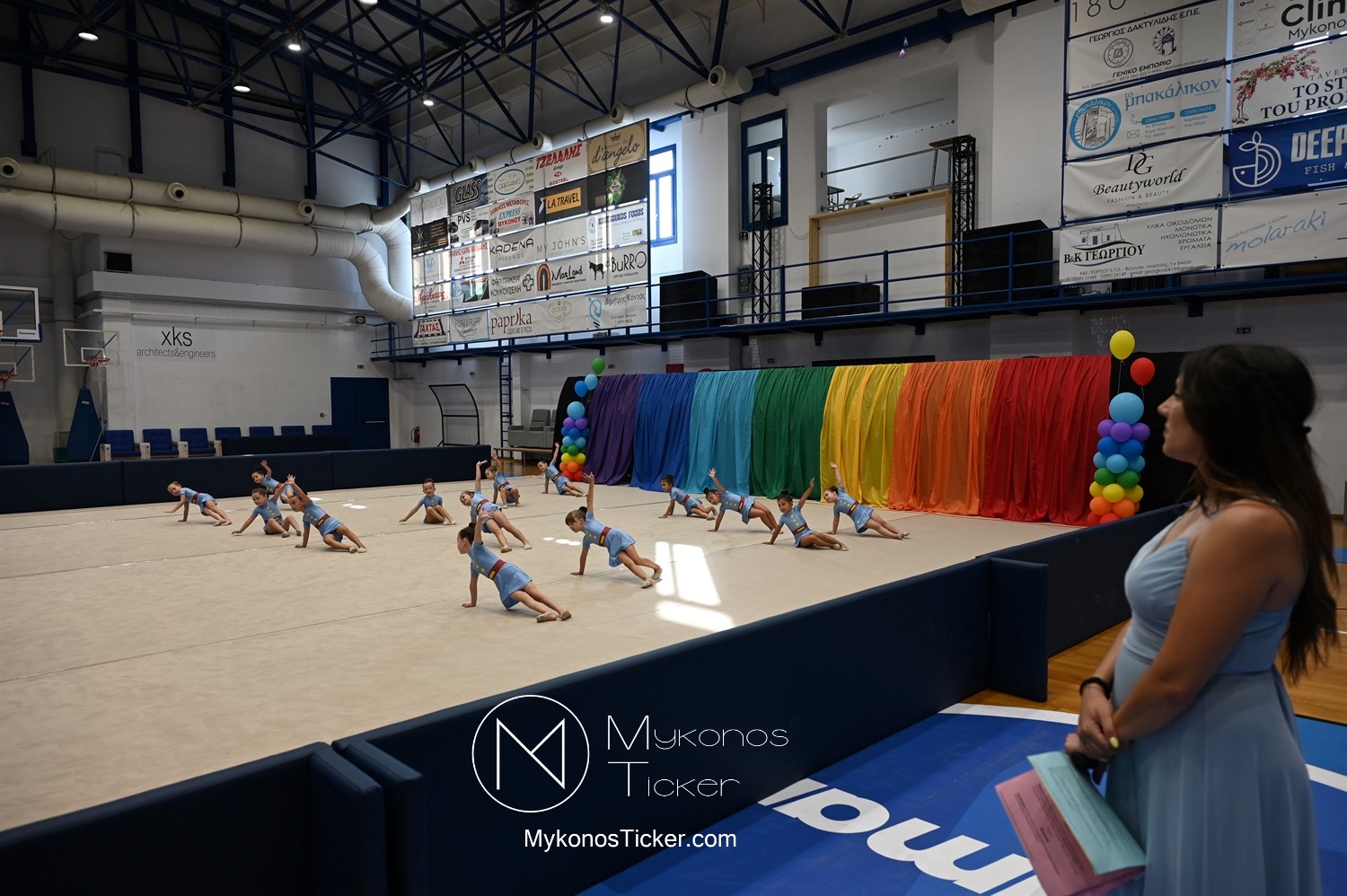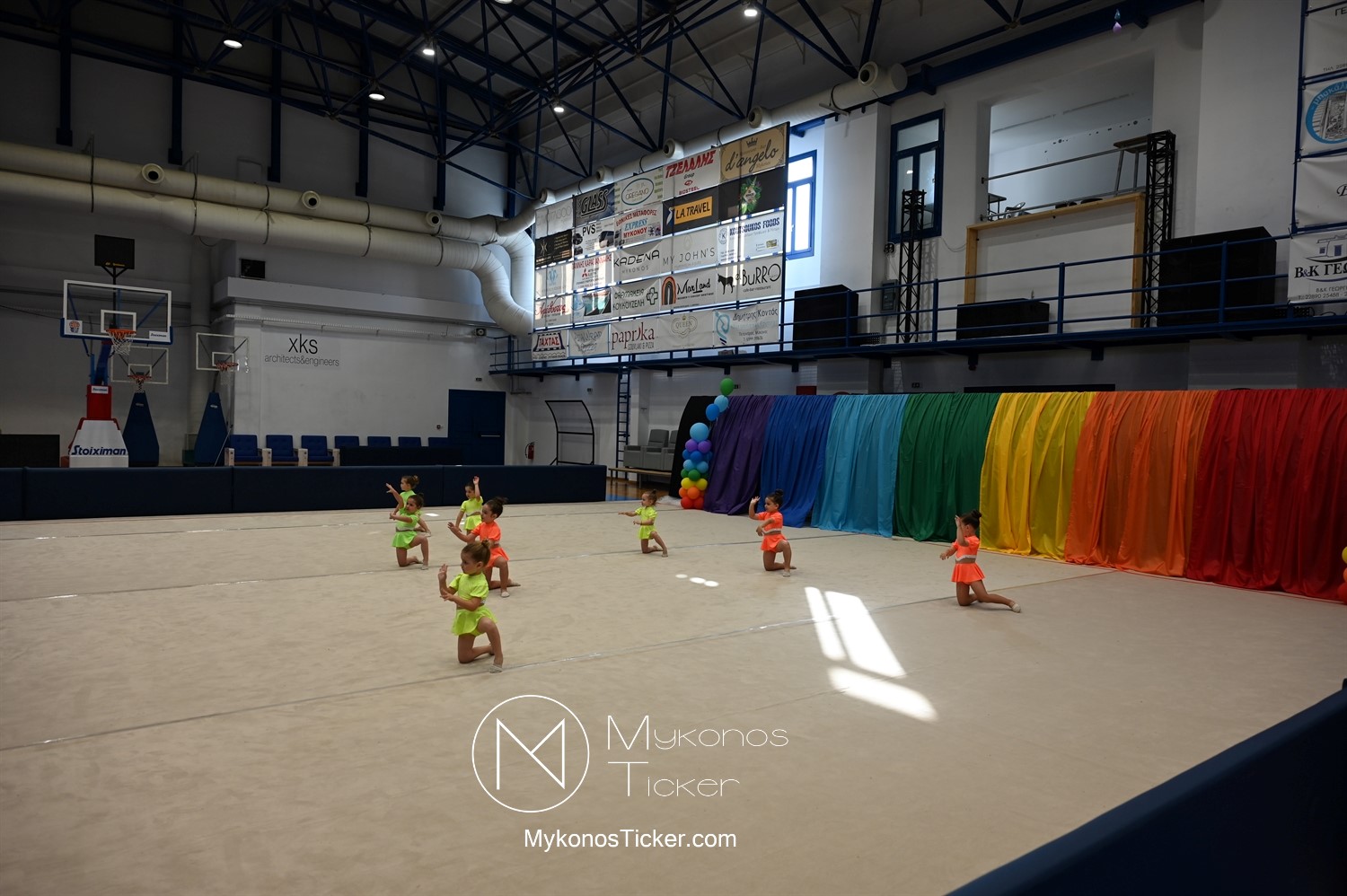 Ο Δήμος Μυκόνου τίμησε τις αθλήτριες και τους προπονητές της Αισθητικής Ομαδικής Γυμναστικής της Α.Ε. Μυκόνου, με παγκόσμιες, διεθνείς και πανελλήνιες διακρίσεις, απονέμοντάς τους συμβολικά τιμητική πλακέτα, σε μία ειδική τελετή στο πλαίσιο της εντυπωσιακής, ετήσιας επίδειξης ρυθμικής γυμναστικής με θέμα «Ταξίδι στον κόσμο των παραμυθιών», στο κλειστό Γήπεδο Μπάσκετ «Π. Χανιώτης» που κατακλύσθηκε με ρυθμό, μουσική, χρώματα και μια σειρά από υπέροχες και πρωτότυπες χορογραφίες ρυθμικής γυμναστικής με μπάλες, στεφάνια, σχοινάκια και κορδέλες, αναδεικνύοντας τη σημασία της χορευτικής παιδείας και της καλλιτεχνικής έκφρασης.