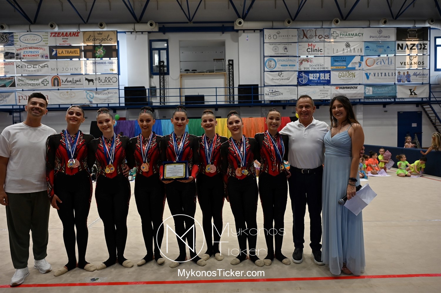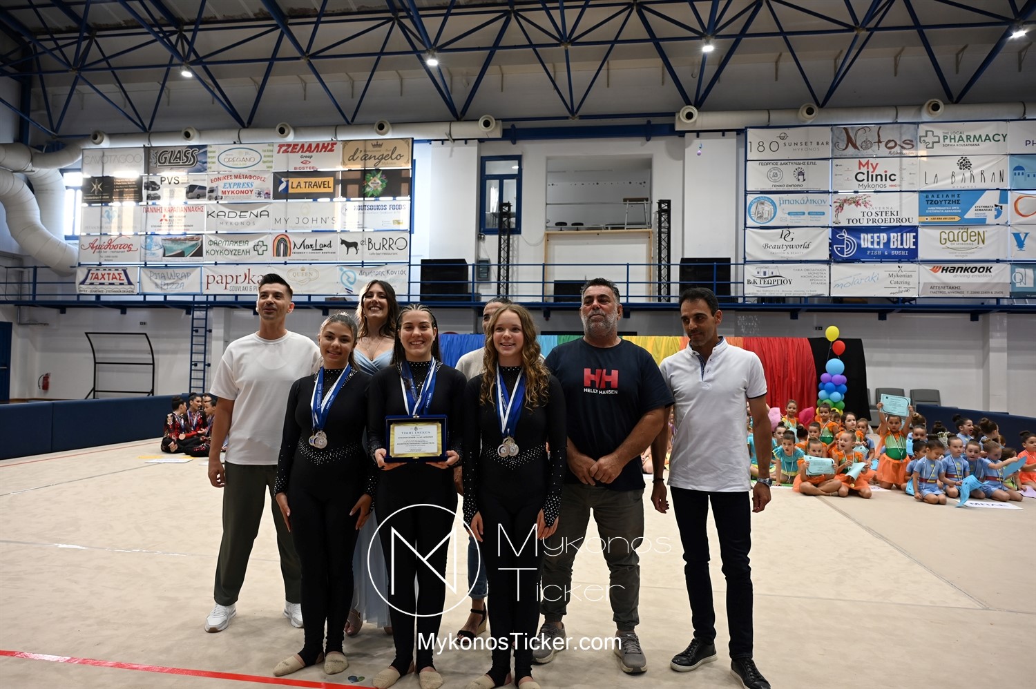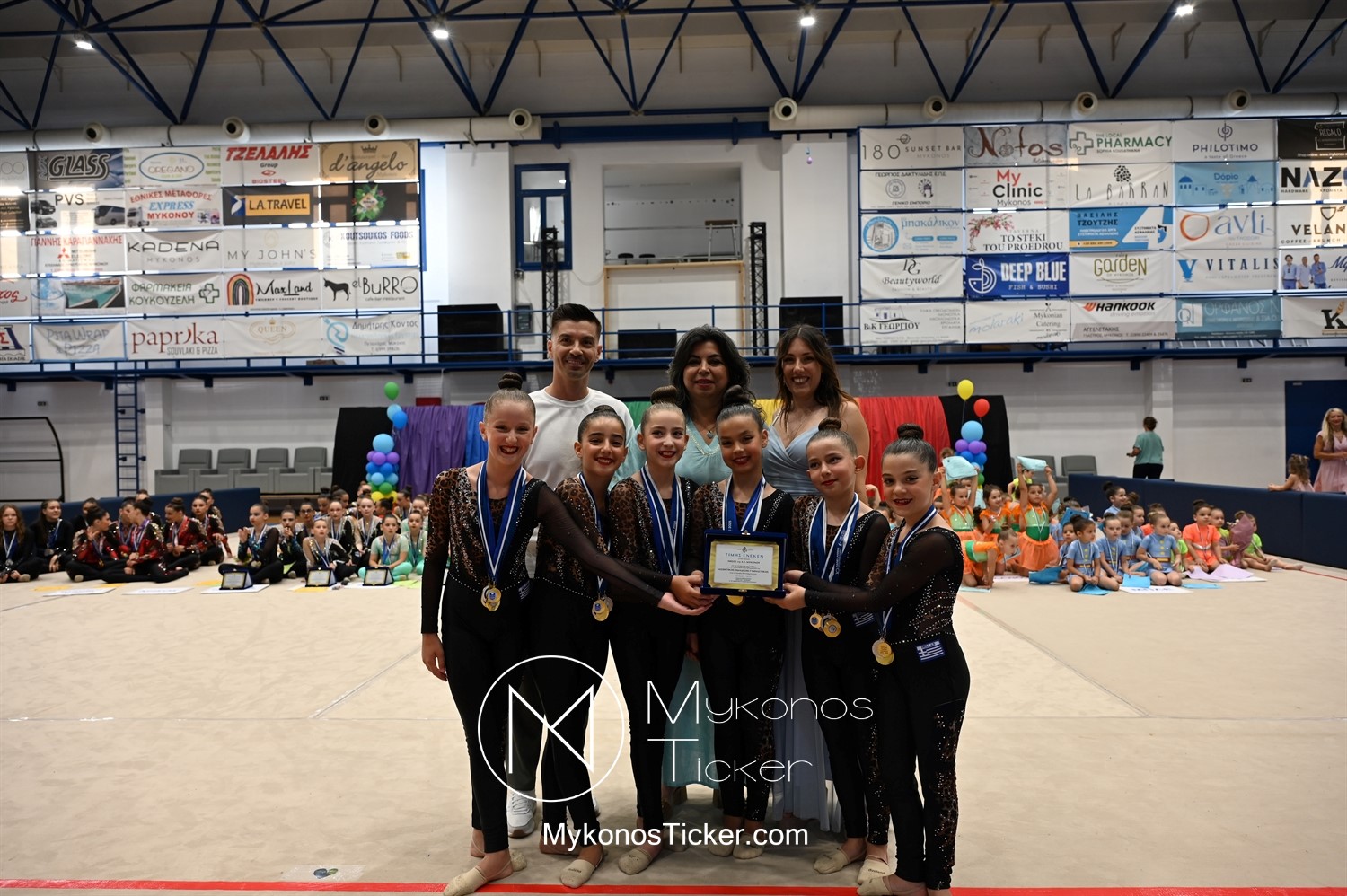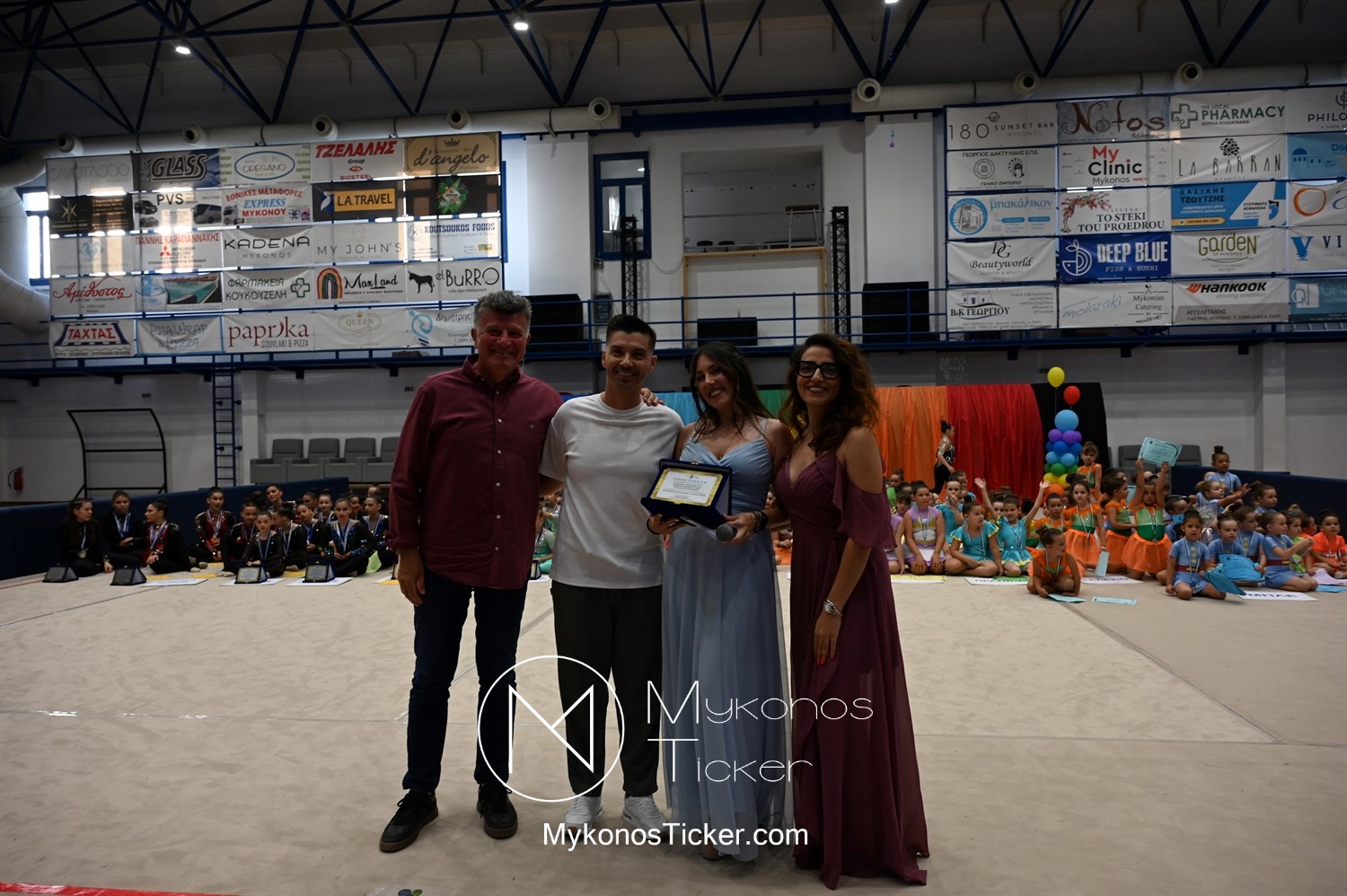 Ο Δήμος Μυκόνου τίμησε τις αθλήτριες και τους προπονητές της Αισθητικής Ομαδικής Γυμναστικής της Α.Ε. Μυκόνου, με παγκόσμιες, διεθνείς και πανελλήνιες διακρίσεις, απονέμοντάς τους συμβολικά τιμητική πλακέτα, σε μία ειδική τελετή στο πλαίσιο της εντυπωσιακής, ετήσιας επίδειξης ρυθμικής γυμναστικής με θέμα «Ταξίδι στον κόσμο των παραμυθιών», στο κλειστό Γήπεδο Μπάσκετ «Π. Χανιώτης» που κατακλύσθηκε με ρυθμό, μουσική, χρώματα και μια σειρά από υπέροχες και πρωτότυπες χορογραφίες ρυθμικής γυμναστικής με μπάλες, στεφάνια, σχοινάκια και κορδέλες, αναδεικνύοντας τη σημασία της χορευτικής παιδείας και της καλλιτεχνικής έκφρασης.