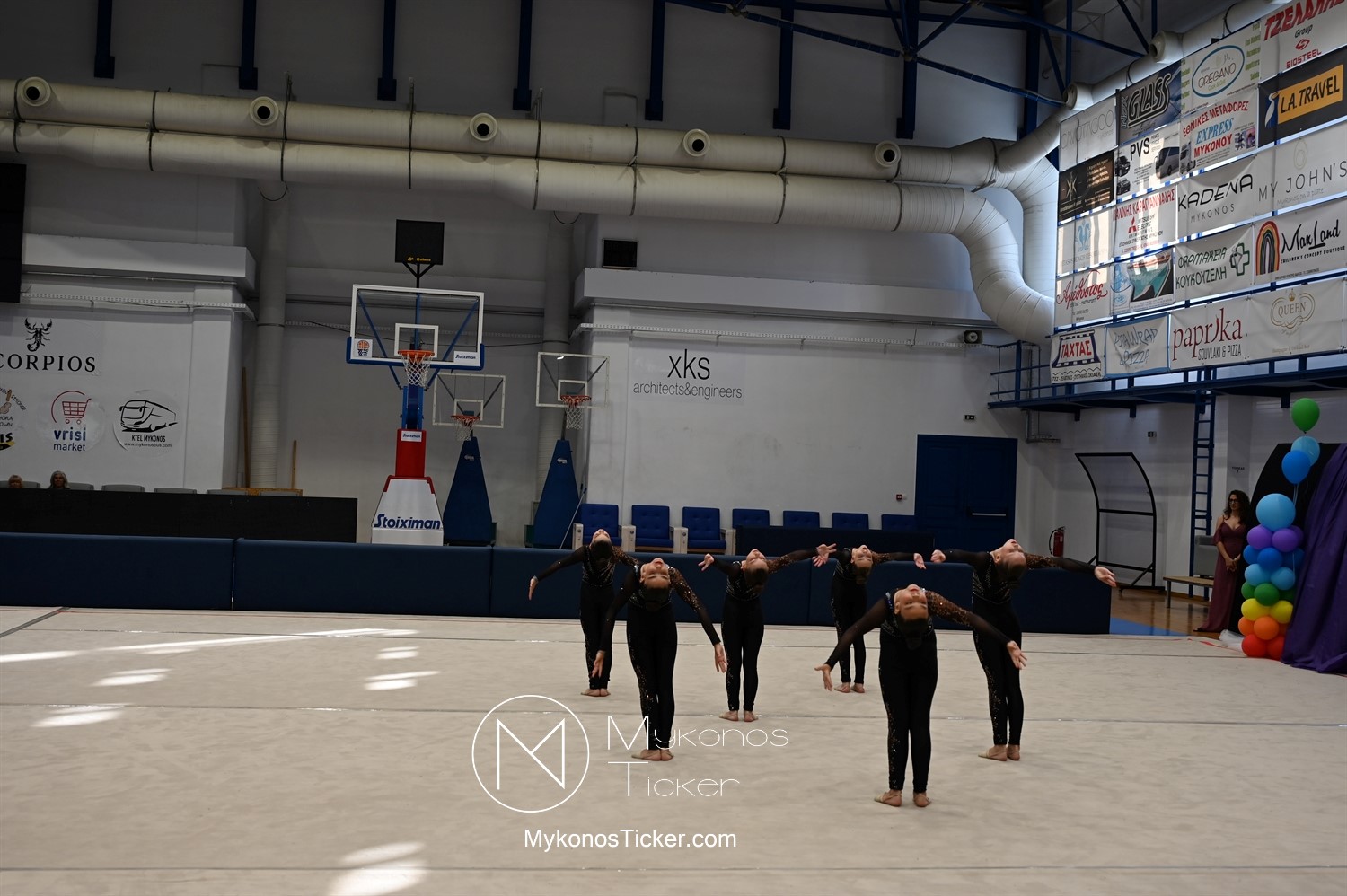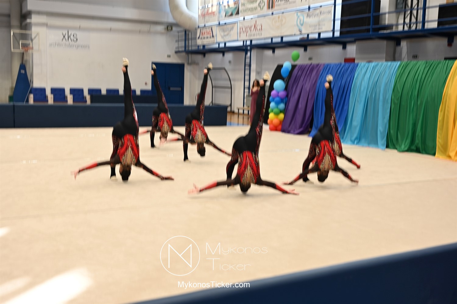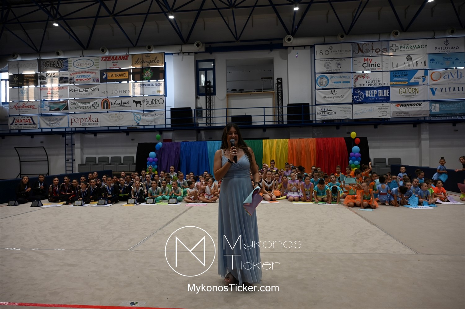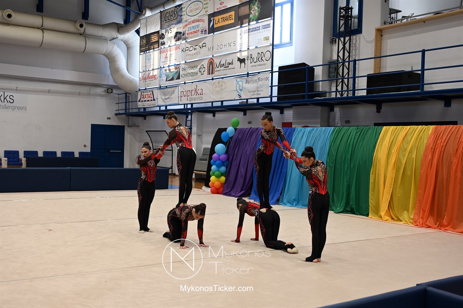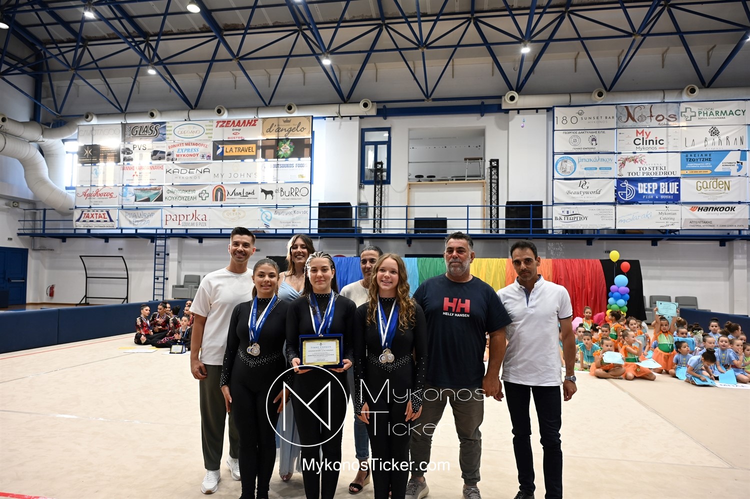 Ο Δήμος Μυκόνου τίμησε τις αθλήτριες και τους προπονητές της Αισθητικής Ομαδικής Γυμναστικής της Α.Ε. Μυκόνου, με παγκόσμιες, διεθνείς και πανελλήνιες διακρίσεις, απονέμοντάς τους συμβολικά τιμητική πλακέτα, σε μία ειδική τελετή στο πλαίσιο της εντυπωσιακής, ετήσιας επίδειξης ρυθμικής γυμναστικής με θέμα «Ταξίδι στον κόσμο των παραμυθιών», στο κλειστό Γήπεδο Μπάσκετ «Π. Χανιώτης» που κατακλύσθηκε με ρυθμό, μουσική, χρώματα και μια σειρά από υπέροχες και πρωτότυπες χορογραφίες ρυθμικής γυμναστικής με μπάλες, στεφάνια, σχοινάκια και κορδέλες, αναδεικνύοντας τη σημασία της χορευτικής παιδείας και της καλλιτεχνικής έκφρασης.