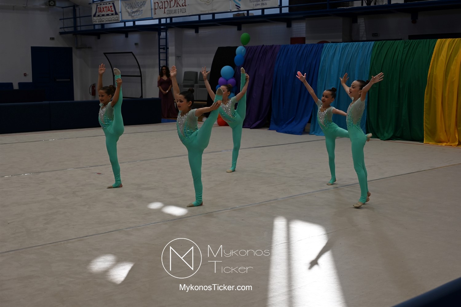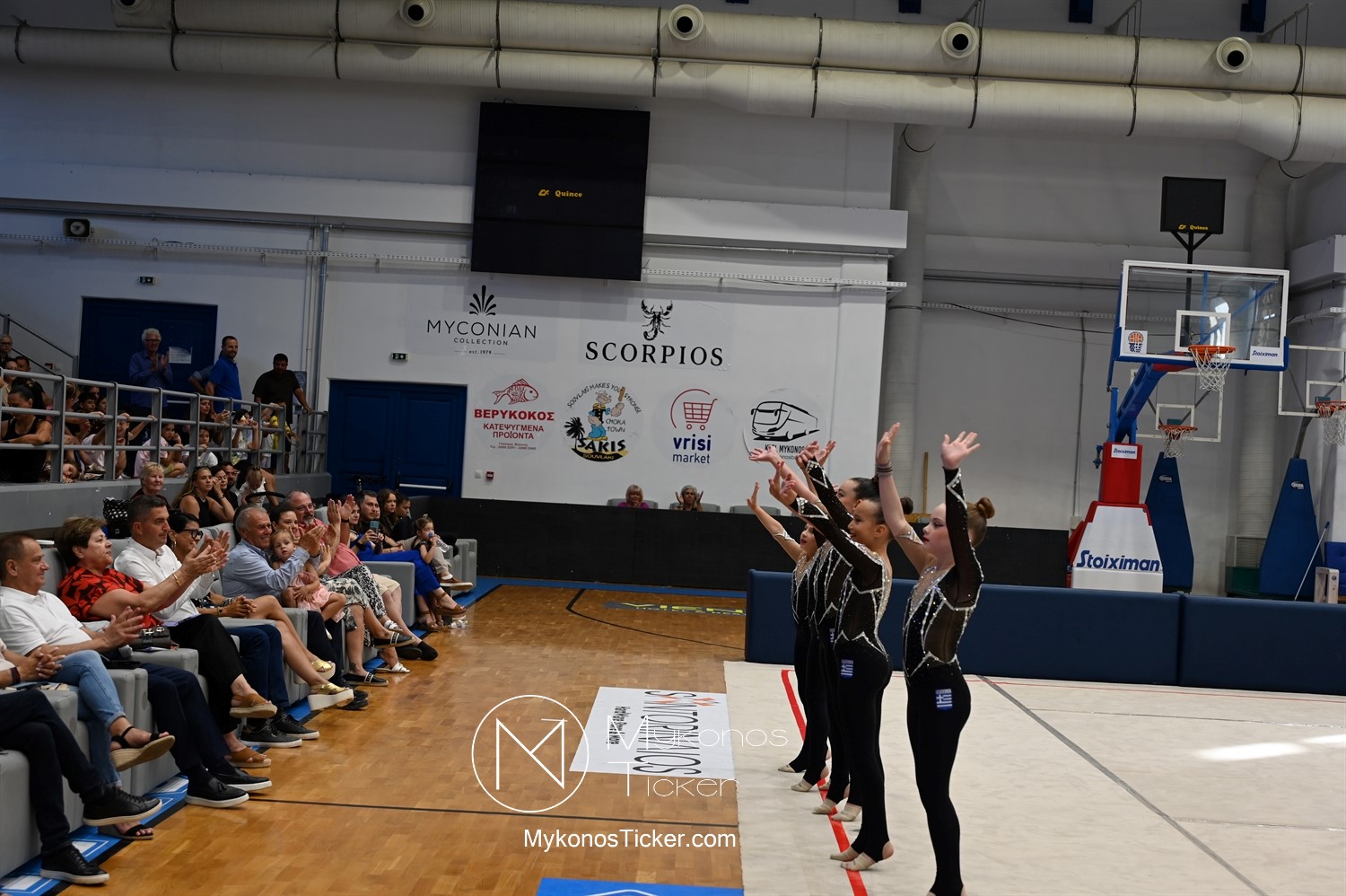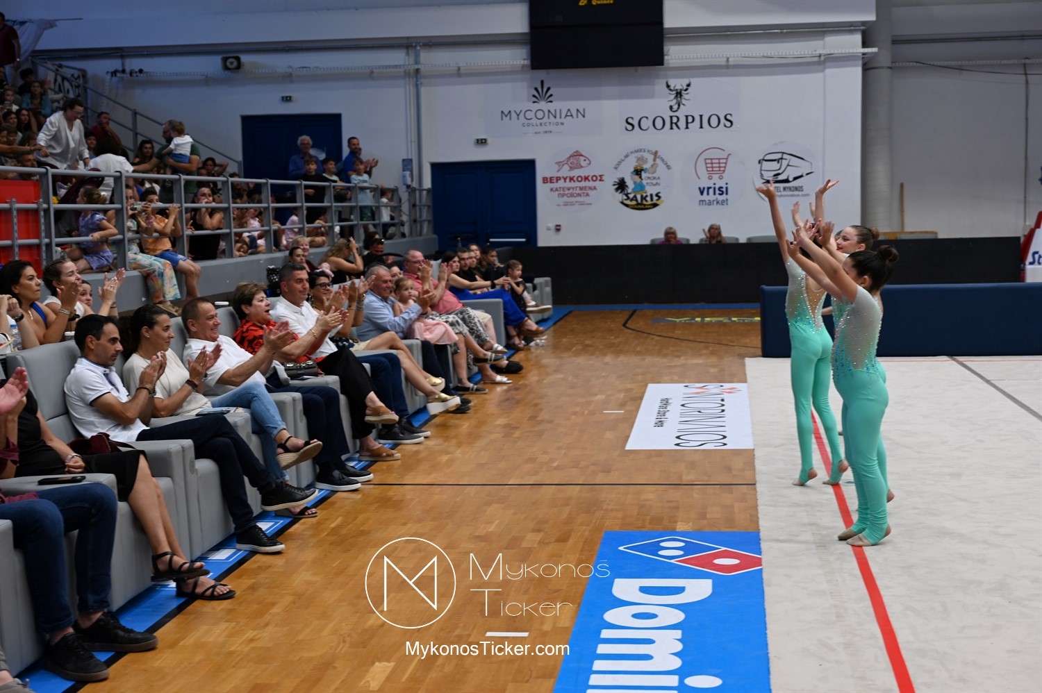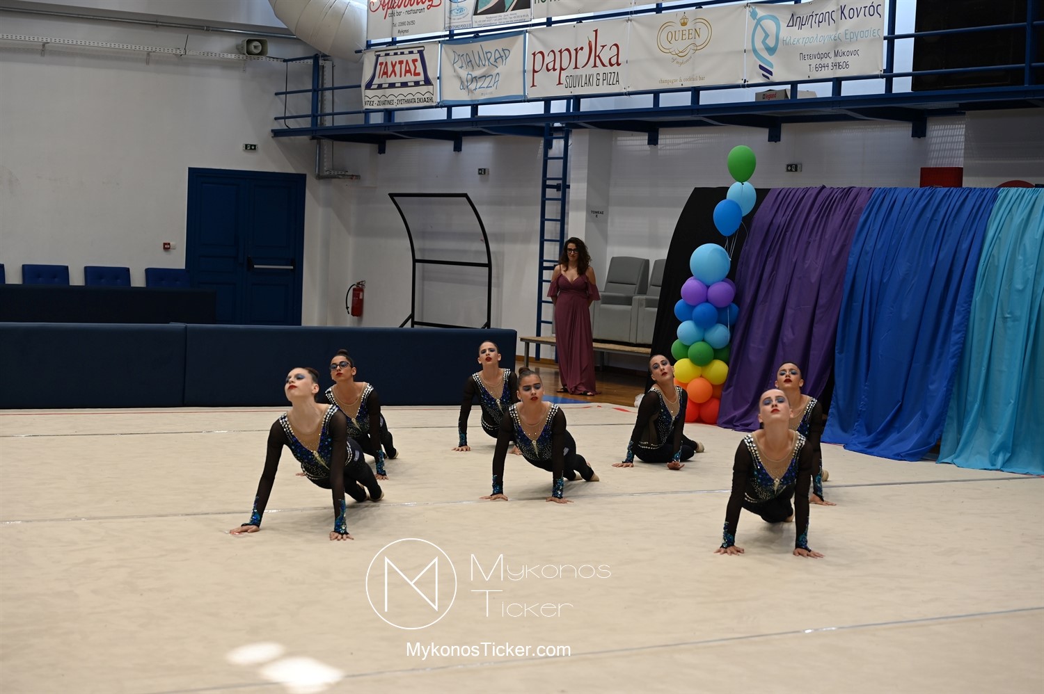 Ο Δήμος Μυκόνου τίμησε τις αθλήτριες και τους προπονητές της Αισθητικής Ομαδικής Γυμναστικής της Α.Ε. Μυκόνου, με παγκόσμιες, διεθνείς και πανελλήνιες διακρίσεις, απονέμοντάς τους συμβολικά τιμητική πλακέτα, σε μία ειδική τελετή στο πλαίσιο της εντυπωσιακής, ετήσιας επίδειξης ρυθμικής γυμναστικής με θέμα «Ταξίδι στον κόσμο των παραμυθιών», στο κλειστό Γήπεδο Μπάσκετ «Π. Χανιώτης» που κατακλύσθηκε με ρυθμό, μουσική, χρώματα και μια σειρά από υπέροχες και πρωτότυπες χορογραφίες ρυθμικής γυμναστικής με μπάλες, στεφάνια, σχοινάκια και κορδέλες, αναδεικνύοντας τη σημασία της χορευτικής παιδείας και της καλλιτεχνικής έκφρασης.