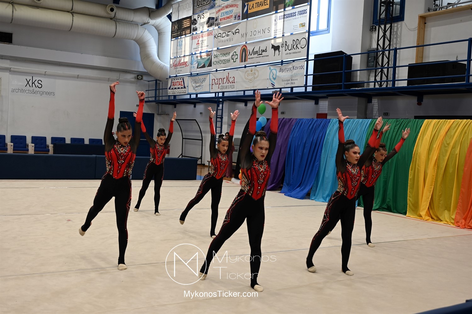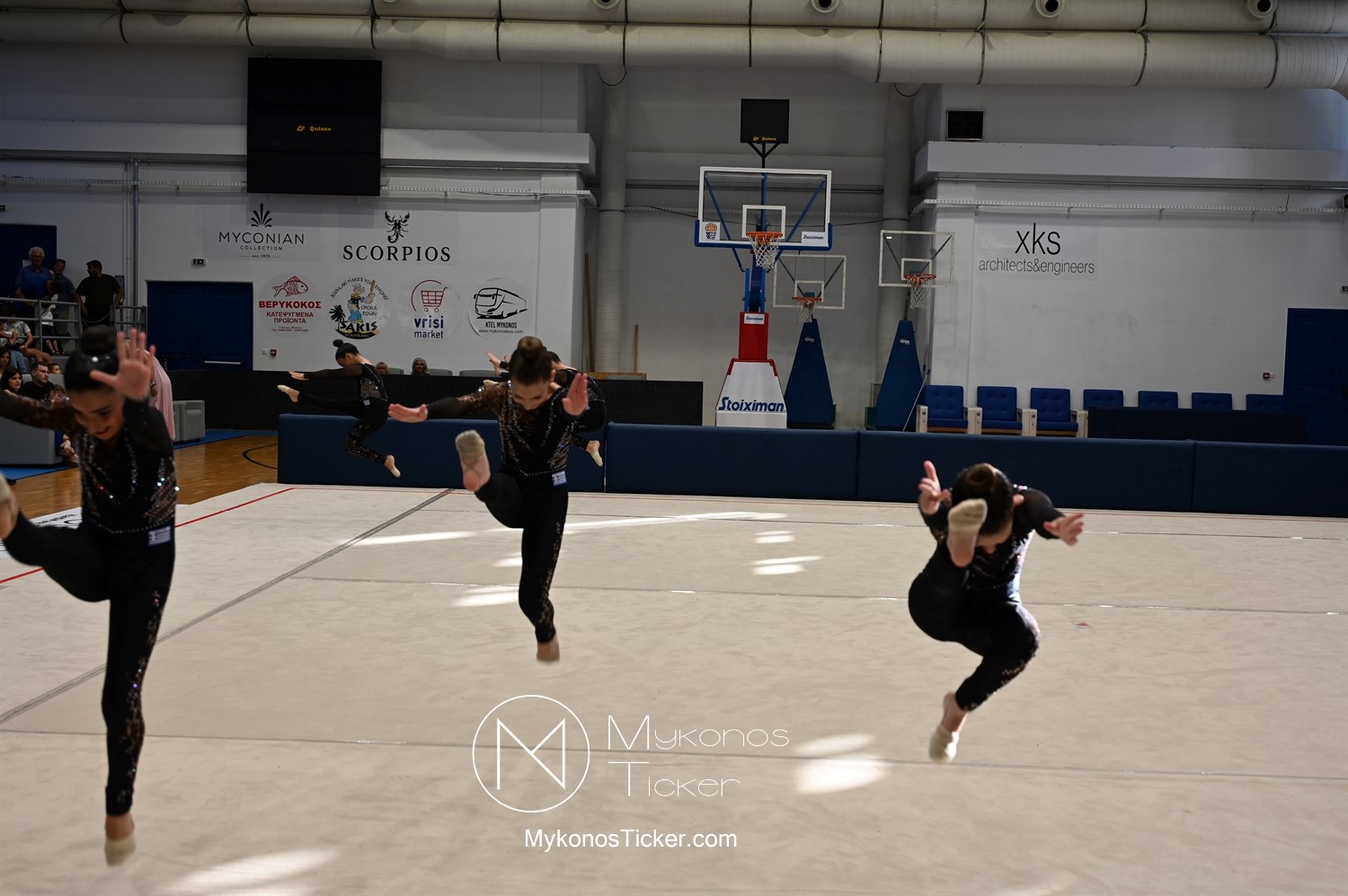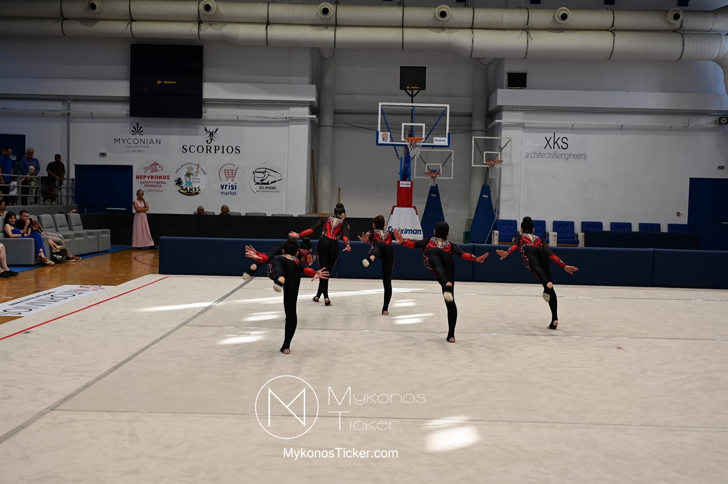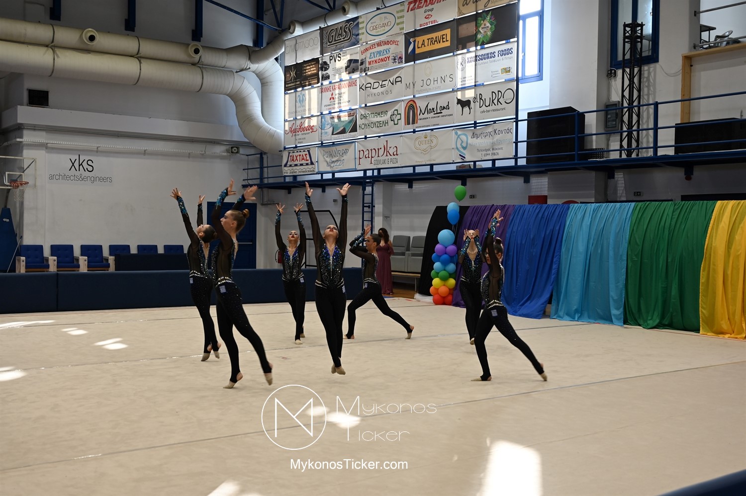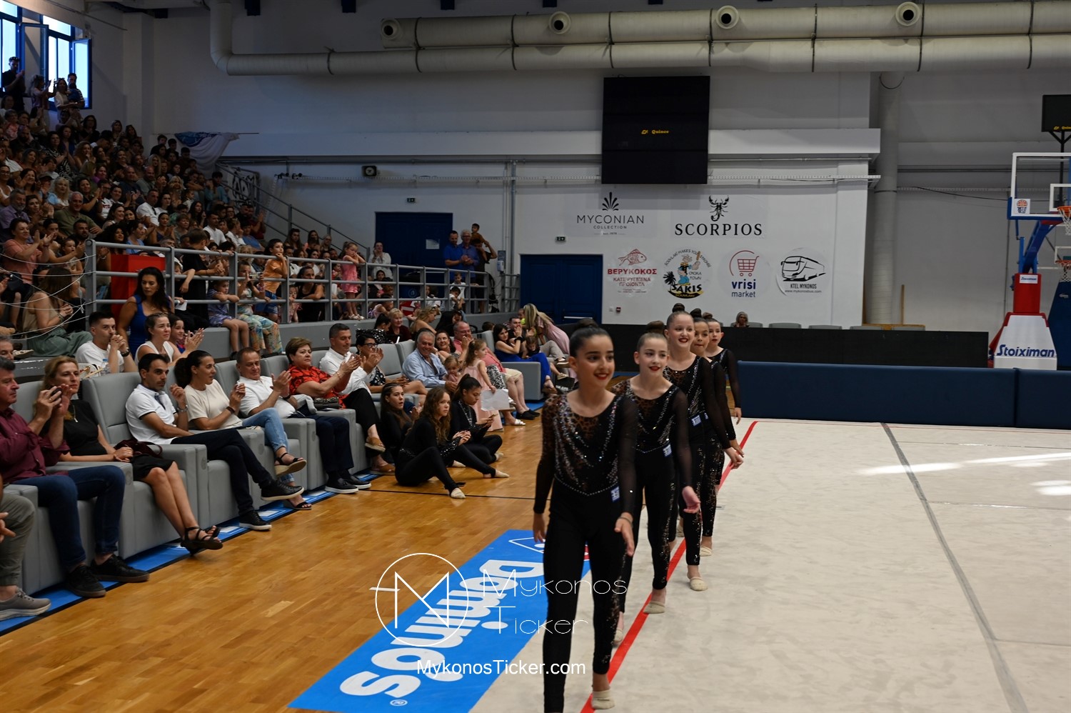 Ο Δήμος Μυκόνου τίμησε τις αθλήτριες και τους προπονητές της Αισθητικής Ομαδικής Γυμναστικής της Α.Ε. Μυκόνου, με παγκόσμιες, διεθνείς και πανελλήνιες διακρίσεις, απονέμοντάς τους συμβολικά τιμητική πλακέτα, σε μία ειδική τελετή στο πλαίσιο της εντυπωσιακής, ετήσιας επίδειξης ρυθμικής γυμναστικής με θέμα «Ταξίδι στον κόσμο των παραμυθιών», στο κλειστό Γήπεδο Μπάσκετ «Π. Χανιώτης» που κατακλύσθηκε με ρυθμό, μουσική, χρώματα και μια σειρά από υπέροχες και πρωτότυπες χορογραφίες ρυθμικής γυμναστικής με μπάλες, στεφάνια, σχοινάκια και κορδέλες, αναδεικνύοντας τη σημασία της χορευτικής παιδείας και της καλλιτεχνικής έκφρασης.
