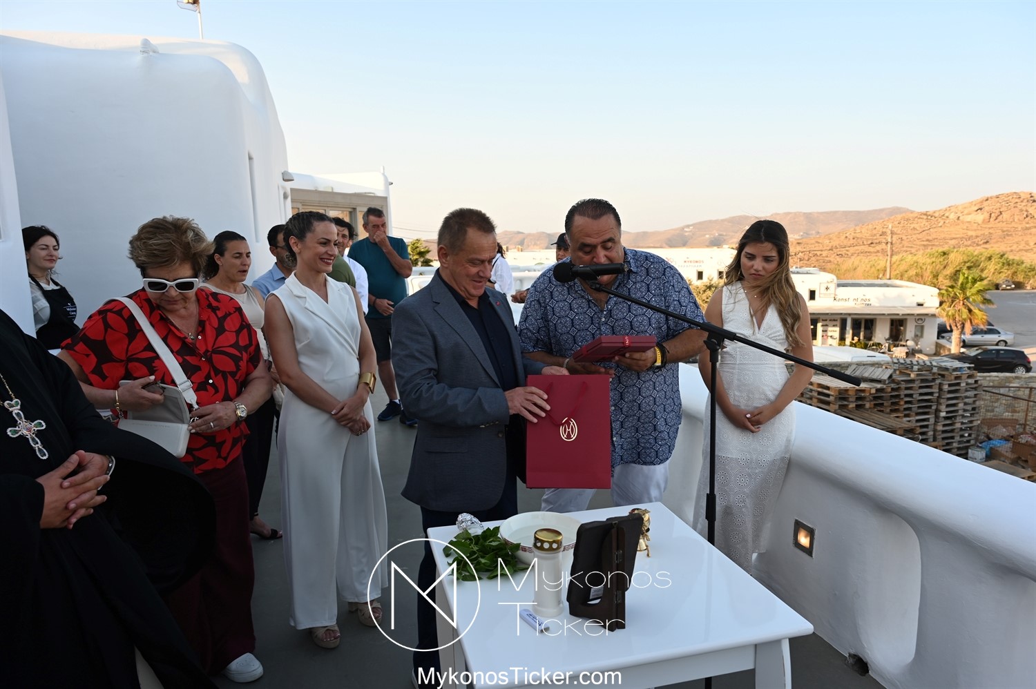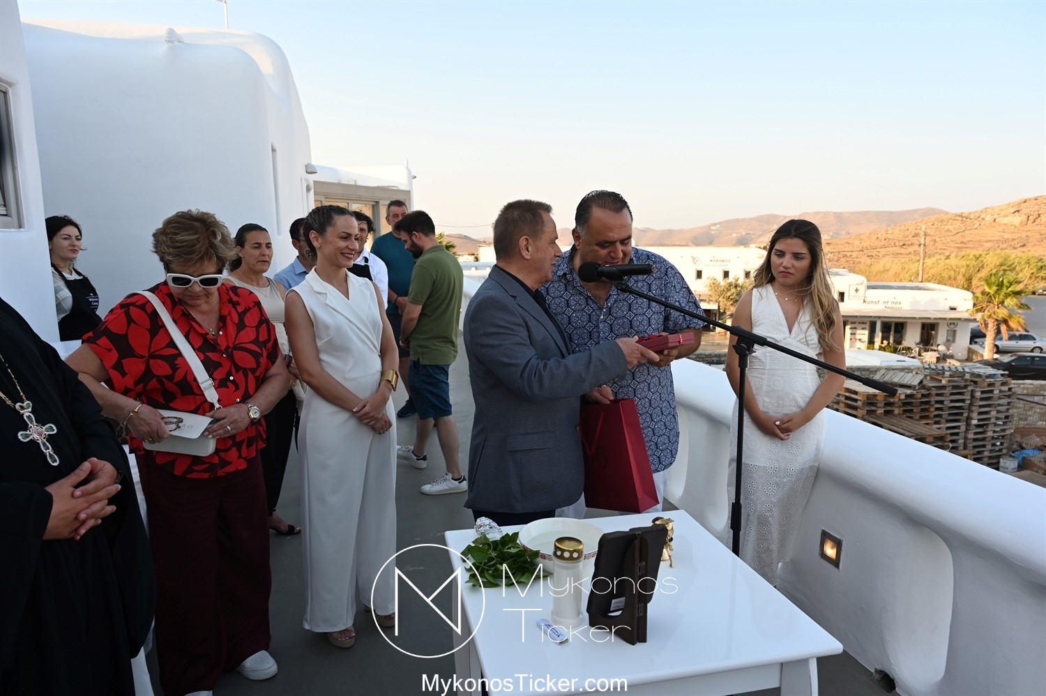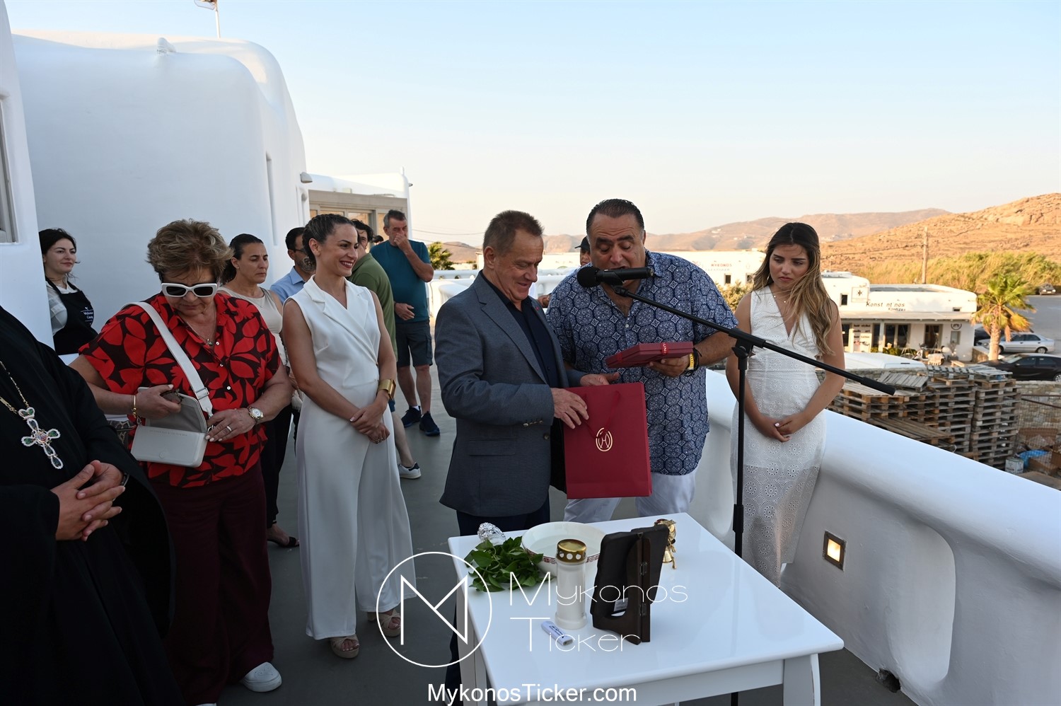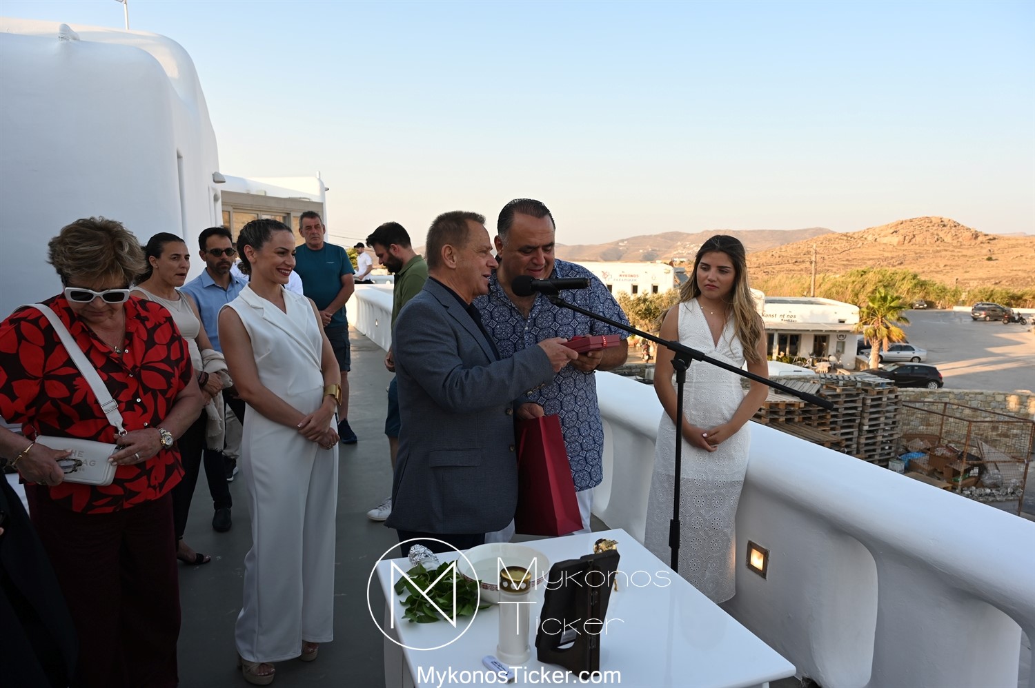 Με την ολοκλήρωση της ομιλίας του, ο Χρήστος Βερώνης προσέφερε αναμνηστικό δώρο του Δήμου Μυκόνου στον Μανώλη Σφακιανάκη.