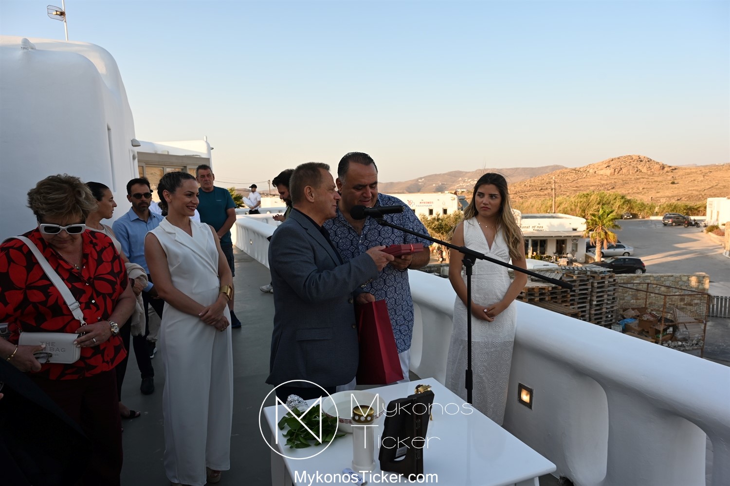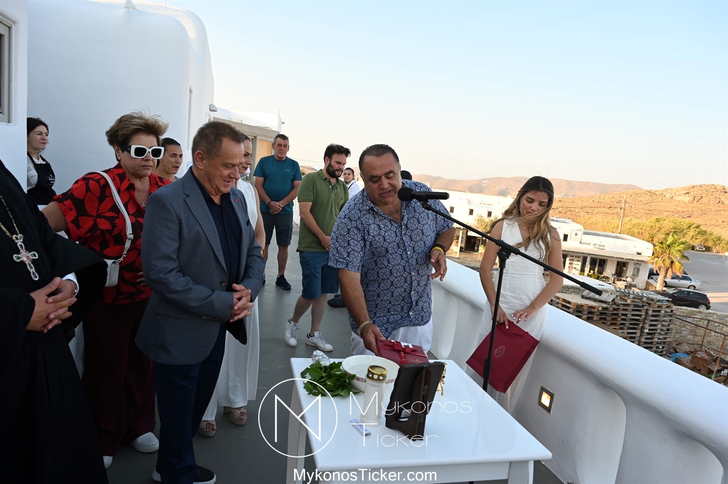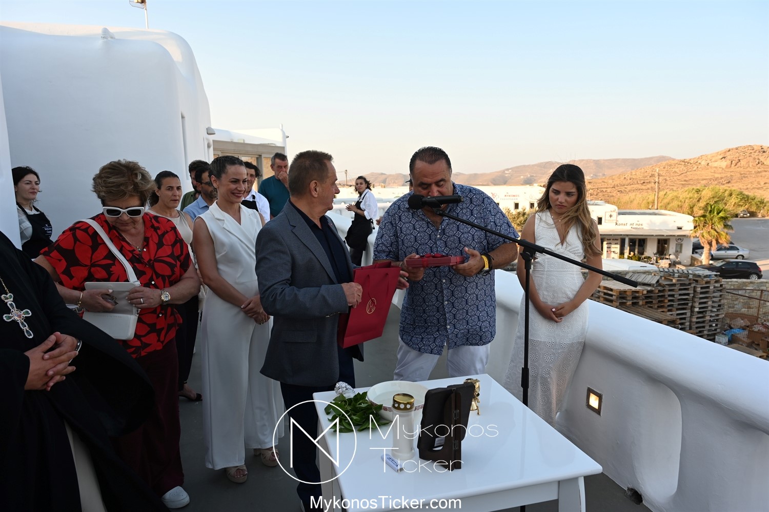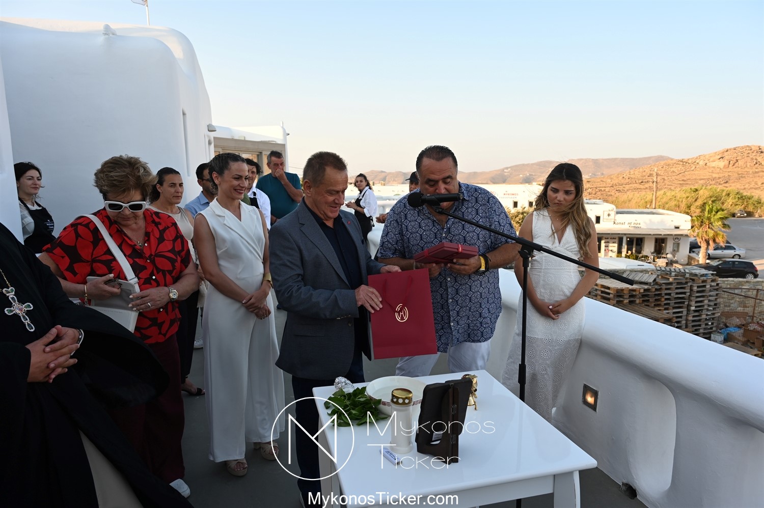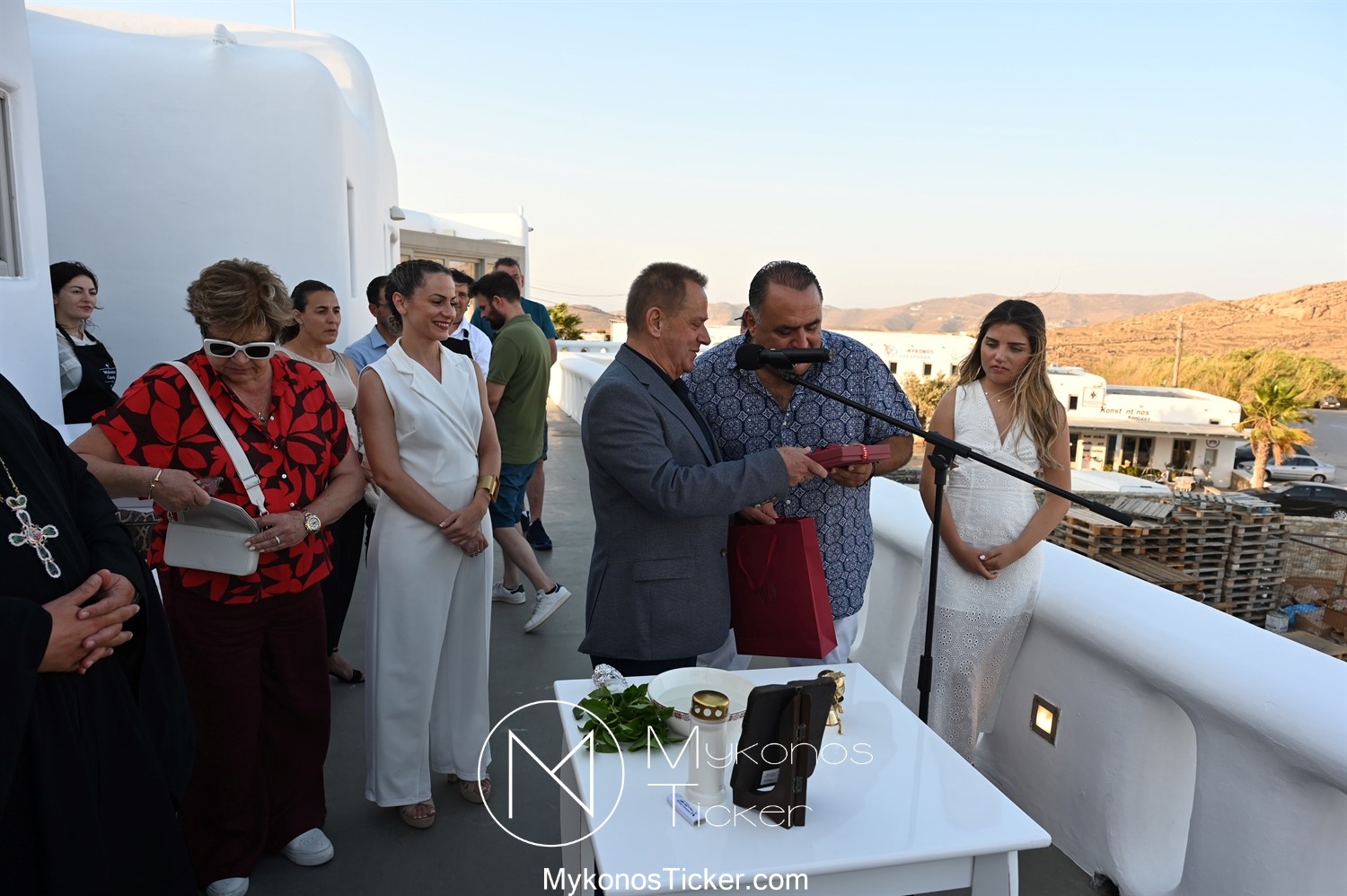 Με την ολοκλήρωση της ομιλίας του, ο Χρήστος Βερώνης προσέφερε αναμνηστικό δώρο του Δήμου Μυκόνου στον Μανώλη Σφακιανάκη.