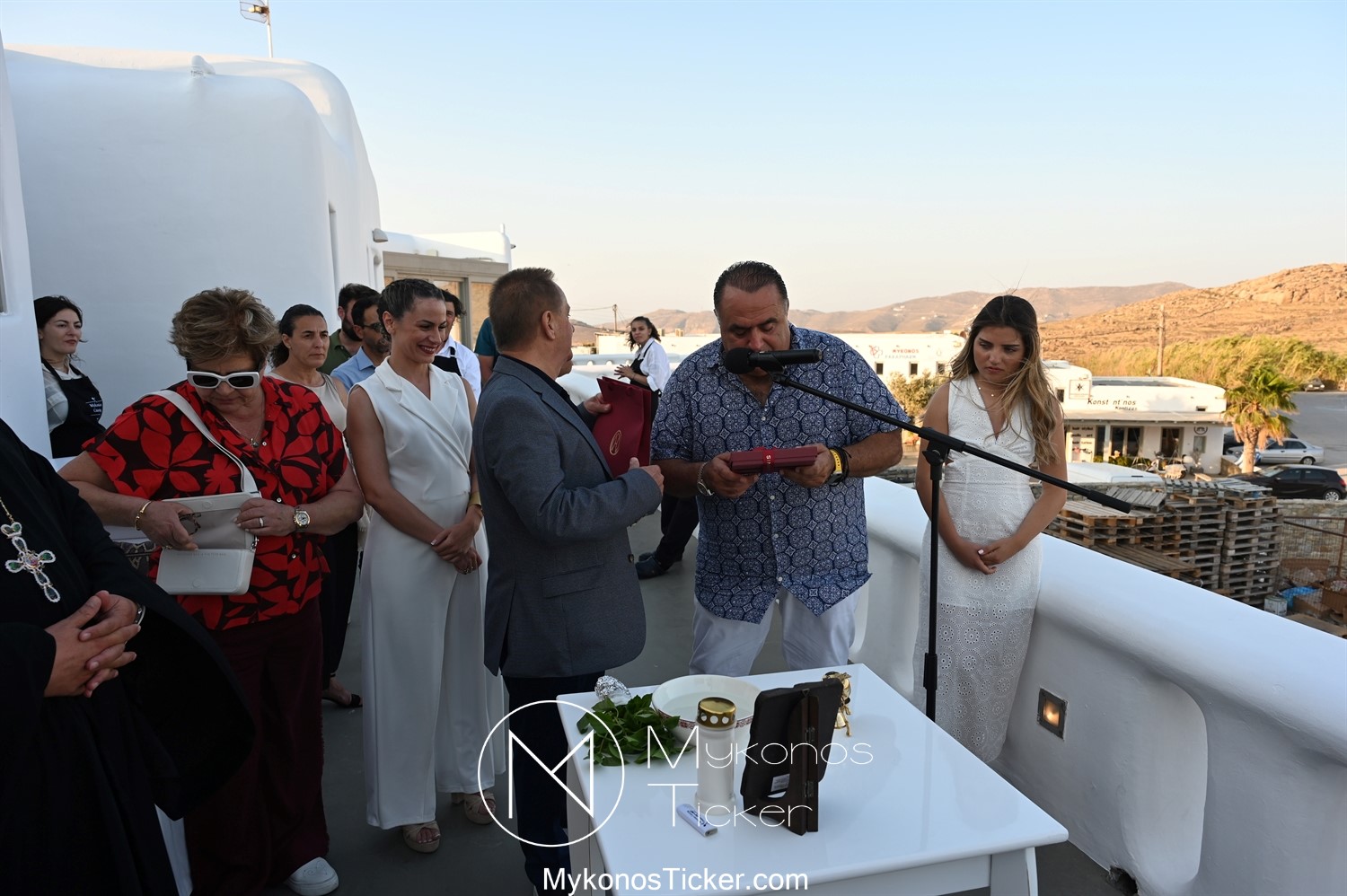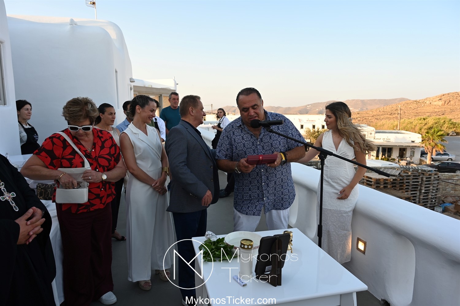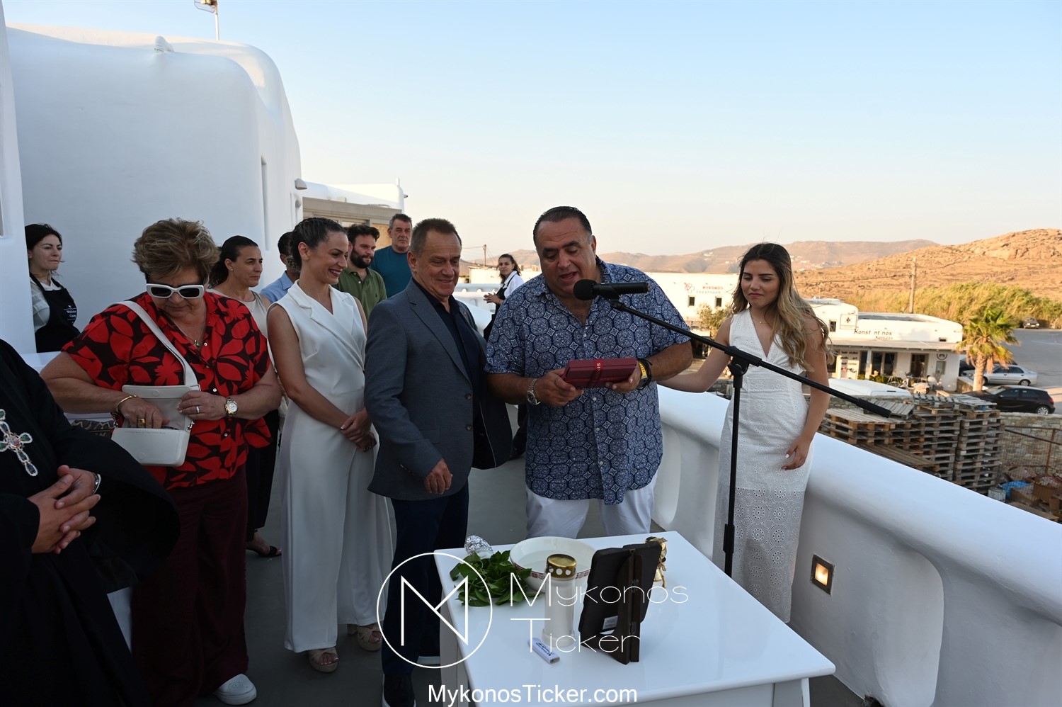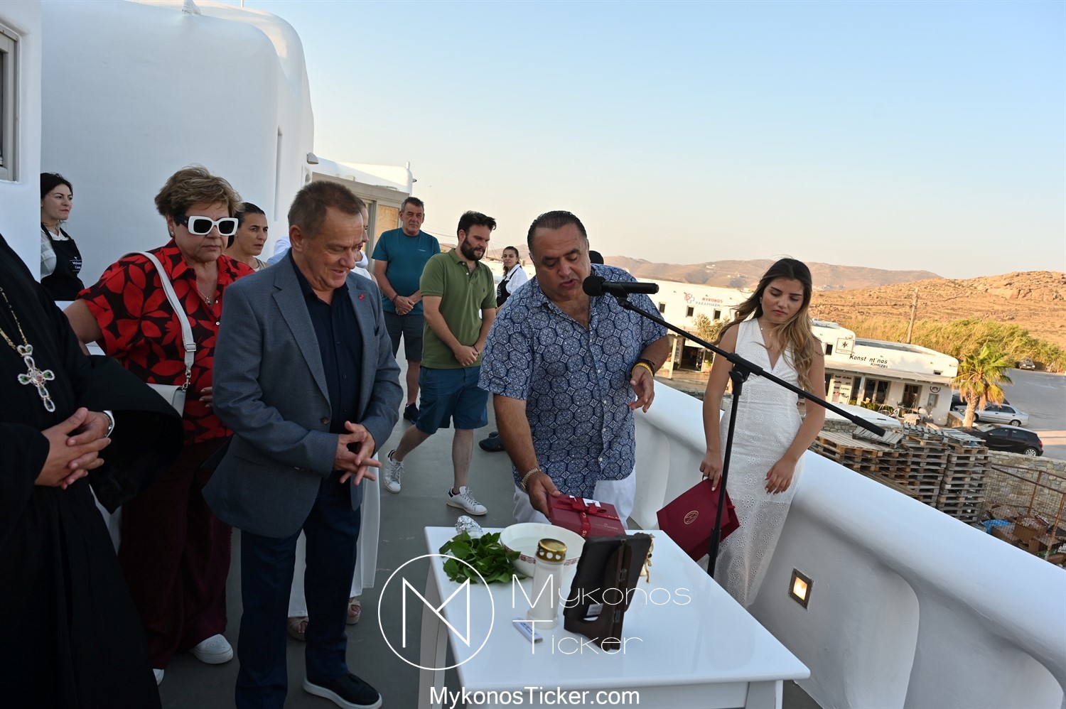 Με την ολοκλήρωση της ομιλίας του, ο Χρήστος Βερώνης προσέφερε αναμνηστικό δώρο του Δήμου Μυκόνου στον Μανώλη Σφακιανάκη.